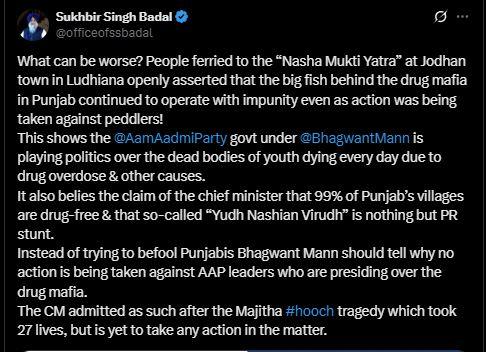 ਲੁਧਿਆਣਾ ਦੇ ਜੋਧਨ ਕਸਬੇ ਵਿੱਚ ਆਯੋਜਿਤ "ਨਸ਼ਾ ਮੁਕਤੀ ਯਾਤਰਾ" ਦਾ ਹਵਾਲਾ ਦਿੰਦੇ ਹੋਏ, ਬਾਦਲ ਨੇ ਕਿਹਾ ਕਿ ਉੱਥੇ ਮੌਜੂਦ ਲੋਕਾਂ ਨੇ ਖੁਦ ਦੱਸਿਆ ਕਿ ਡਰੱਗ ਮਾਫੀਆ ਦੇ ਵੱਡੇ ਖਿਡਾਰੀ ਅਜੇ ਵੀ ਪੰਜਾਬ ਵਿੱਚ ਖੁੱਲ੍ਹੇਆਮ ਕੰਮ ਕਰ ਰਹੇ ਹਨ ਜਦੋਂ ਕਿ ਸਰਕਾਰ ਸਿਰਫ ਛੋਟੇ ਪੱਧਰ ਦੇ ਤਸਕਰਾਂ ਵਿਰੁੱਧ ਕਾਰਵਾਈ ਕਰ ਰਹੀ ਹੈ।