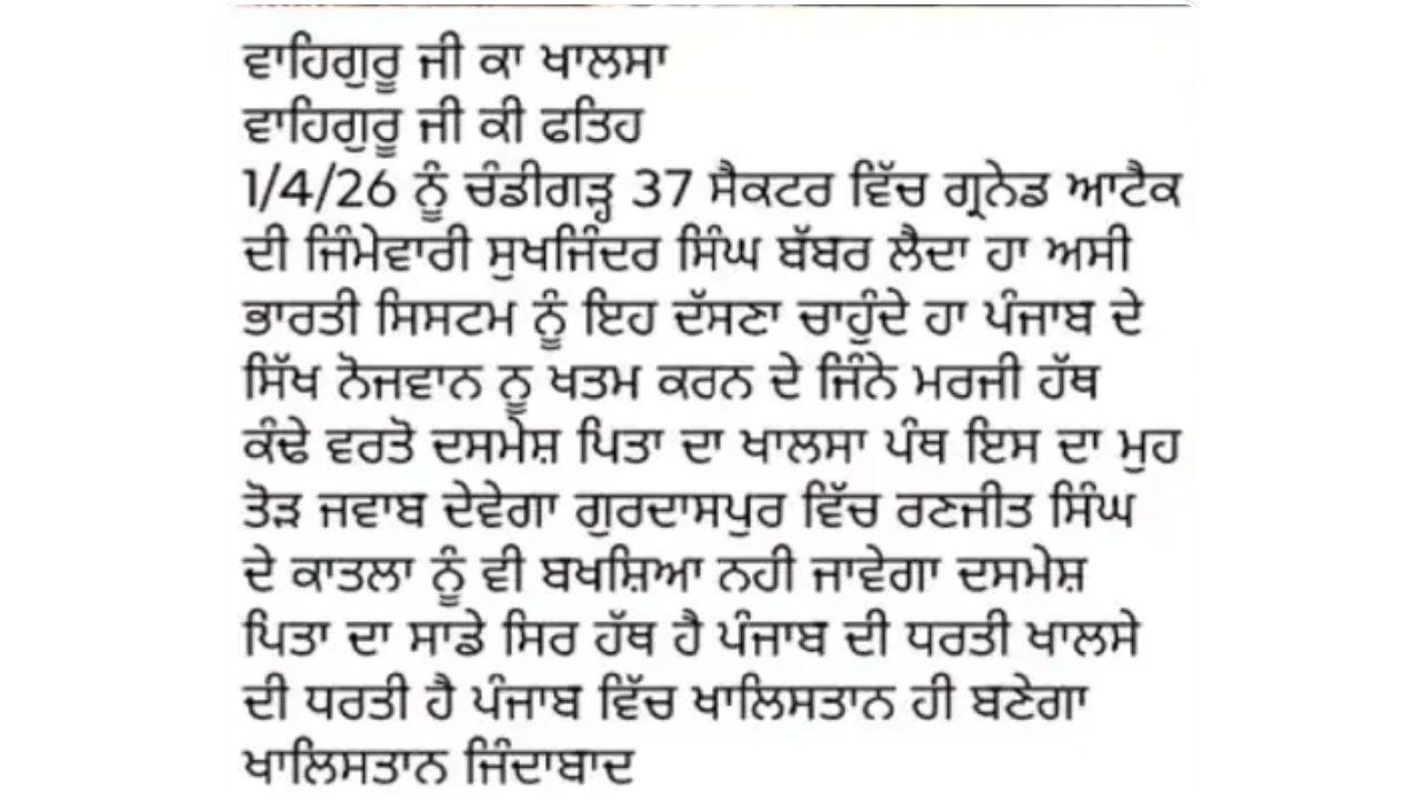 BJP Office Grenade Attack : ਚੰਡੀਗੜ੍ਹ ਦੇ ਸੈਕਟਰ 37 ਸਥਿਤ ਭਾਜਪਾ ਦਫਤਰ ਅੱਗੇ ਗ੍ਰੇਨੇਡ ਹਮਲੇ ਨੂੰ ਲੈ ਕੇ ਪੁਲਿਸ ਵੱਲੋਂ ਬਾਰੀਕੀ ਨਾਲ ਜਾਂਚ ਕੀਤੀ ਜਾ ਰਹੀ ਹੈ। ਚੰਡੀਗੜ੍ਹ ਪੁਲਿਸ ਦੀਆਂ ਤਮਾਮ ਟੀਮਾਂ ਅਤੇ ਫੋਰੈਂਸਿਕ ਟੀਮਾਂ ਤੋਂ ਇਲਾਵਾ ਕੌਮੀ ਜਾਂਚ ਏਜੰਸੀ (NIA) ਵੀ ਪਹੁੰਚੀ ਹੋਈ ਹੈ। ਇਸ ਮਾਮਲੇ ਵਿੱਚ ਗ੍ਰੇਨੇਡ ਹਮਲੇ ਦੀ ਵੀਡੀਓ ਸਾਹਮਣੇ ਆਉਣ ਤੋਂ ਬਾਅਦ ਹੁਣ ਇੱਕ ਖਾਲਿਸਤਾਨੀ ਸਮਰਥਕ ਨੇ ਜ਼ਿੰਮੇਵਾਰੀ ਲਈ ਹੈ। ਇਸ ਦੀ ਇੱਕ ਕਥਿਤ ਪੋਸਟ ਵੀ ਸਾਹਮਣੇ ਆਈ ਹੈ। (ਪੀਟੀਸੀ ਨਿਊਜ਼ ਪੋਸਟ ਦੇ ਪੁਖਤਾ ਹੋਣ ਬਾਰੇ ਕੋਈ ਪੁਸ਼ਟੀ ਨਹੀਂ ਕਰਦਾ।)