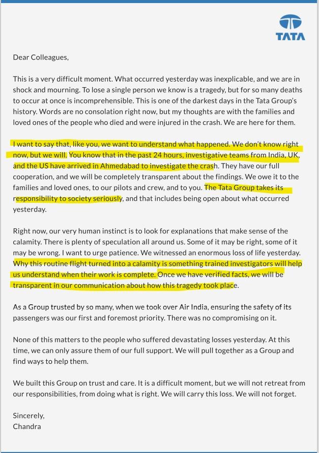ਚੰਦਰਸ਼ੇਖਰਨ ਨੇ ਕਿਹਾ ਕਿ ਜਦੋਂ ਤੋਂ ਟਾਟਾ ਗਰੁੱਪ ਨੇ ਏਅਰ ਇੰਡੀਆ ਨੂੰ ਸੰਭਾਲਿਆ ਹੈ, ਯਾਤਰੀਆਂ ਦੀ ਸੁਰੱਖਿਆ ਸਭ ਤੋਂ ਵੱਡੀ ਤਰਜੀਹ ਰਹੀ ਹੈ। ਉਨ੍ਹਾਂ ਨੇ ਪੀੜਤ ਪਰਿਵਾਰਾਂ ਨੂੰ ਪੂਰਾ ਸਮਰਥਨ ਦੇਣ ਦਾ ਵਾਅਦਾ ਕੀਤਾ ਅਤੇ ਕਿਹਾ, "ਅਸੀਂ ਇਸ ਸੰਕਟ ਦਾ ਸਾਹਮਣਾ ਇਕਜੁੱਟ ਹੋ ਕੇ ਕਰਾਂਗੇ ਅਤੇ ਮਦਦ ਕਰਨ ਦੇ ਤਰੀਕੇ ਲੱਭਾਂਗੇ।"