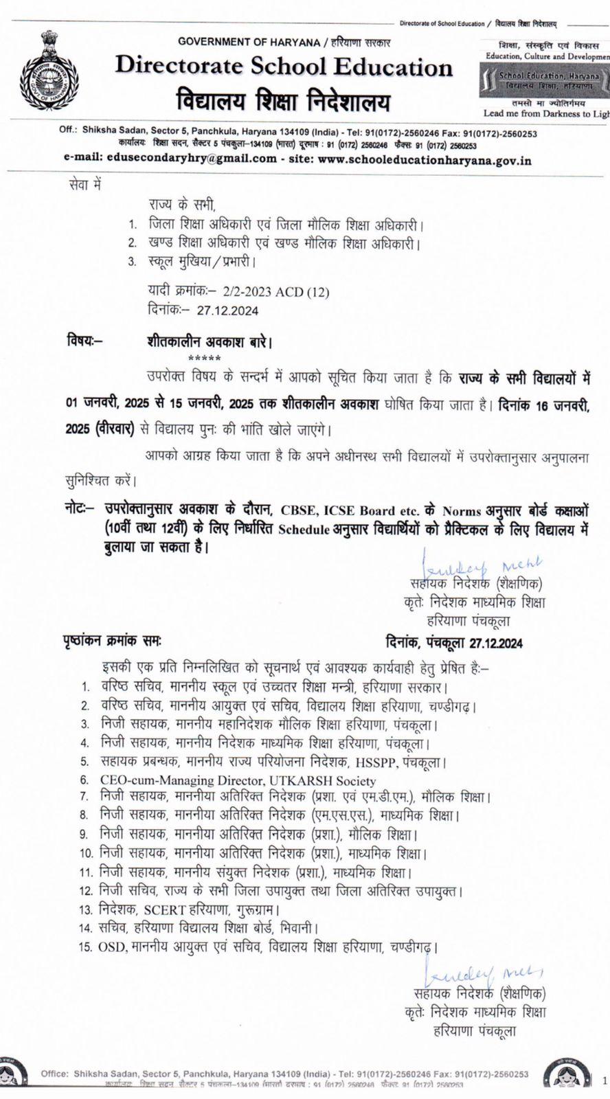 हरियाणा के सभी स्कूलों के लिए हुई शीतकालीन छुट्टियों की घोषणा, स्कूल शिक्षा निदेशालय ने जारी किए आदेश