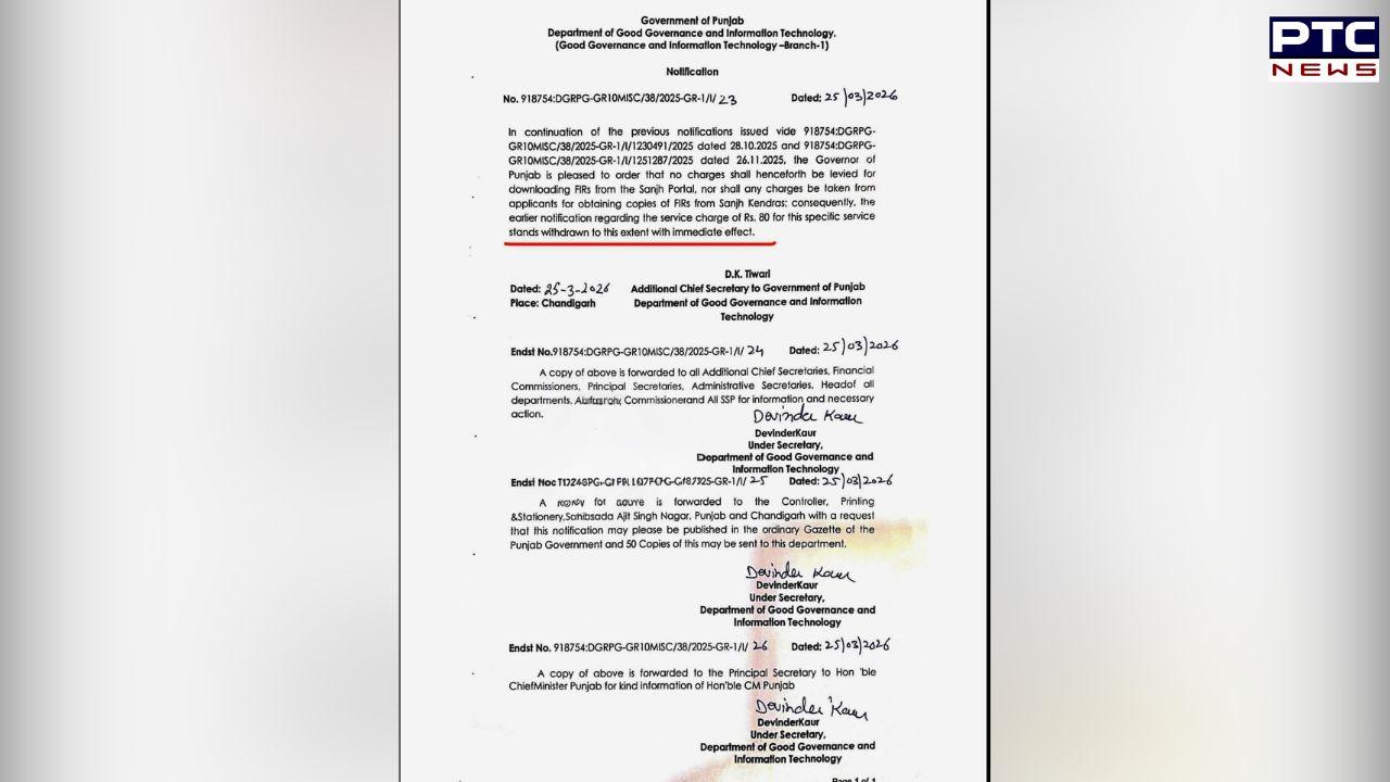 The government issued a fresh notification saying with the approval of the Punjab governor, no charges will be levied for downloading FIRs from the Sanjh Portal.