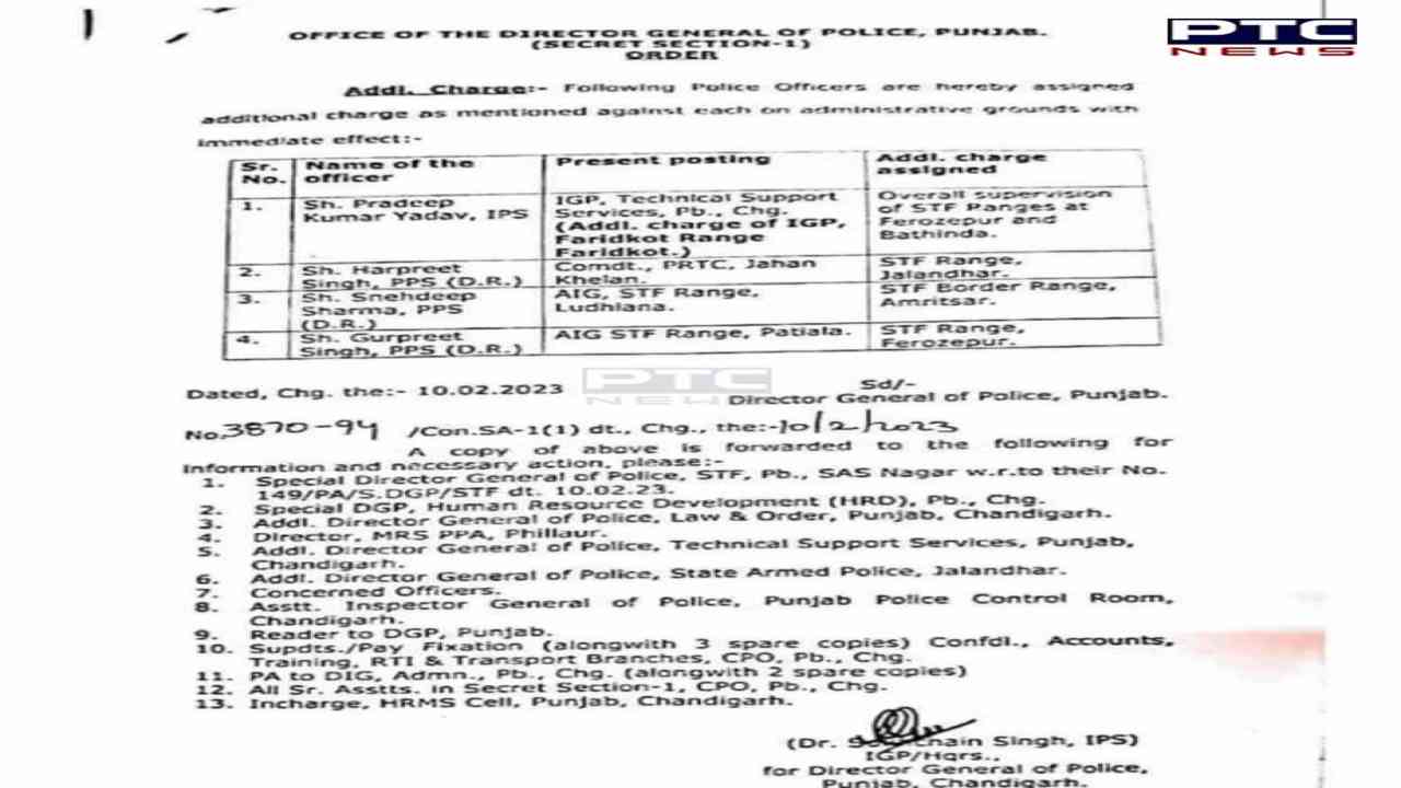 According to orders issued by the Punjab DGP, IPS Pradeep Kumar Yadav, who has been holding the charge of IG Technical Support Service, Punjab, will now also oversee the entire range of STF ranges at Ferozepur and Bathinda. Along with these, he is already holding the charge of IG Faridkot range.