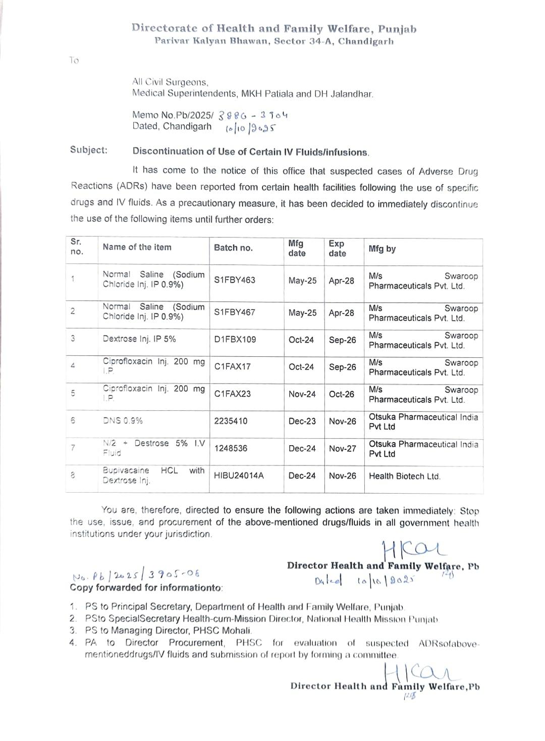“Our stand is clear that patient care is our topmost priority; therefore, we have stopped the usage of these IV fluids as a precautionary measure. The health department is maintaining strict vigil to ensure that only quality medicines and fluids are supplied to hospitals. No compromise will be tolerated when it comes to the safety of patients,” he added.