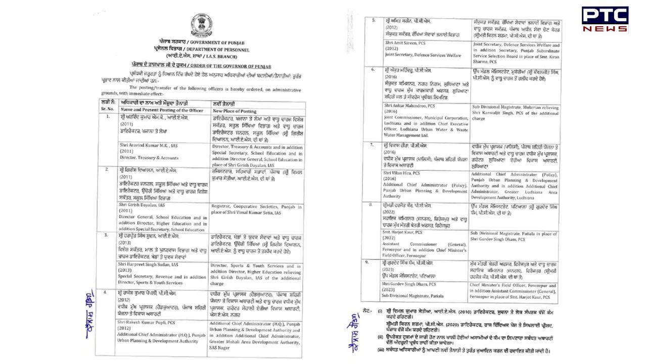 PTC Web Desk: In a significant administrative reshuffle, the Punjab Government on Thursday transferred several IAS and PCS officers across departments and districts. As per the official orders, nine senior officers have been assigned new responsibilities with immediate effect.