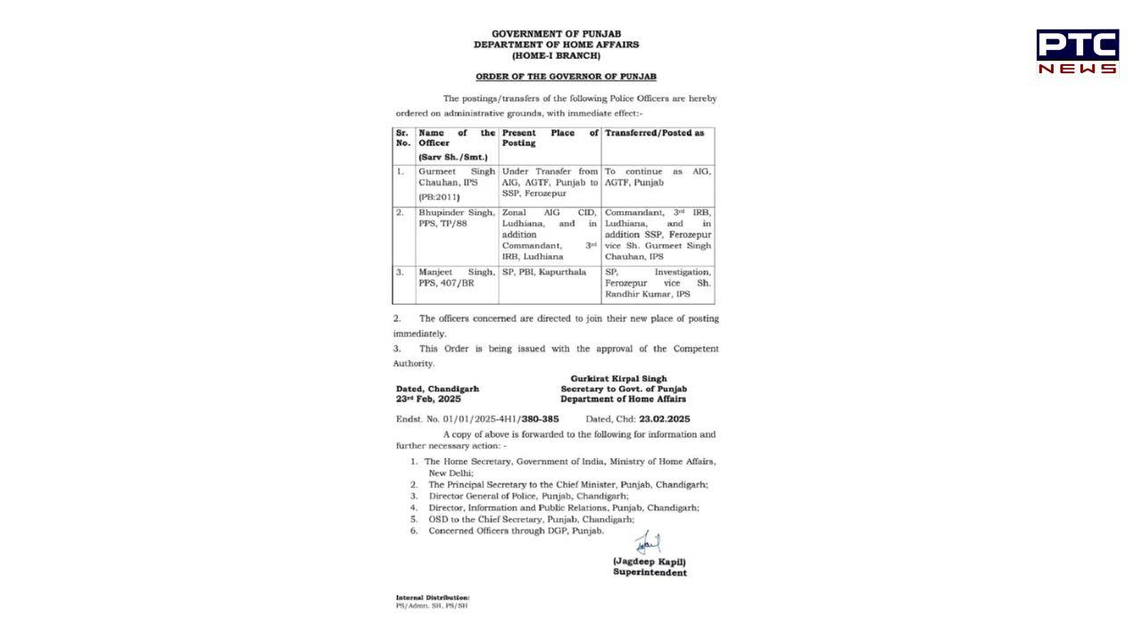 PTC Web Desk: Following its defeat in the Delhi elections, the Aam Aadmi Party-led Punjab government continues to reshuffle officials, with the latest move involving the transfer of three senior police officials, including an IPS officer. In a recent order, IPS officer Gurmeet Singh Chauhan, who was appointed as SSP Ferozepur just two days ago, has been reassigned as AIG of the Anti-Gangster Task Force (AGTF). His previous position as SSP Ferozepur has now been handed over to PPS officer Bhupinder Singh.