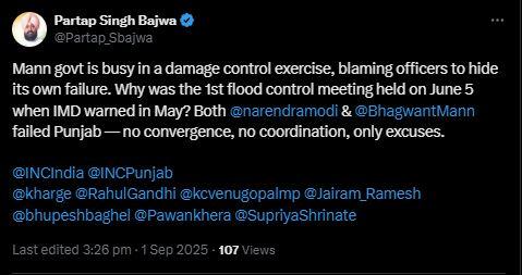 ਬਾਜਵਾ ਨੇ ਕਿਹਾ ਕਿ ਮੋਦੀ ਅਤੇ ਮਾਨ ਦੋਵੇਂ ਸਰਕਾਰਾਂ ਪੰਜਾਬ ਨਾਲ ਧੋਖਾ ਕਰਨ ਦੀ ਦੋਸ਼ੀ ਹਨ। ਉਨ੍ਹਾਂ ਕਿਹਾ ਕਿ ਰੋਕਥਾਮ ਦੇ ਉਪਾਅ ਕਰਨ ਅਤੇ ਲੋਕਾਂ ਦੀ ਰੱਖਿਆ ਕਰਨ ਦੀ ਬਜਾਏ, ਉਹ ਹੁਣ ਇਕ ਦੂਜੇ ਤੇ ਦੋਸ਼ ਮੜ੍ਹਨ ਦੀ ਖੇਡ, ਸੰਕੇਤਕ ਘੋਸ਼ਣਾਵਾਂ ਅਤੇ ਫੋਟੋ-ਓਪਸ ਵਿੱਚ ਸ਼ਾਮਲ ਹੋਣਗੇ। ਪੰਜਾਬ ਦੇ ਅੰਨਦਾਤਿਆਂ ਨੇ ਆਪਣੀਆਂ ਫ਼ਸਲਾਂ, ਘਰ ਅਤੇ ਰੋਜ਼ੀ-ਰੋਟੀ ਗੁਆ ਦਿੱਤੀ ਹੈ। ਉਹ ਜਵਾਬਦੇਹੀ ਦੇ ਹੱਕਦਾਰ ਹਨ, ਬਹਾਨੇ ਨਹੀਂ। ਹੁਣ ਸਮਾਂ ਆ ਗਿਆ ਹੈ ਕਿ ਦੋਵੇਂ ਸਰਕਾਰਾਂ ਆਪਣੀ ਅਸਫਲਤਾ ਨੂੰ ਸਵੀਕਾਰ ਕਰਨ ਅਤੇ ਇਹ ਯਕੀਨੀ ਬਣਾਉਣ ਲਈ ਗੰਭੀਰ ਕਦਮ ਚੁੱਕਣ ਕਿ ਅਜਿਹੀਆਂ ਦੁਖਾਂਤ ਦੁਬਾਰਾ ਨਾ ਵਾਪਰਨ।