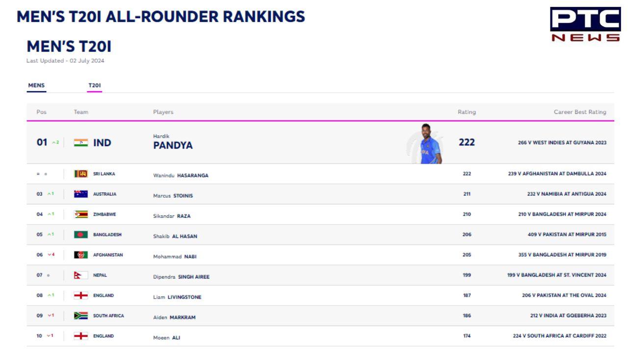 ICC T20I Player Rankings | Hardik Pandya climbed to the No. 1 spot in the ICC T20I all-rounder rankings, as per the ICC official website.