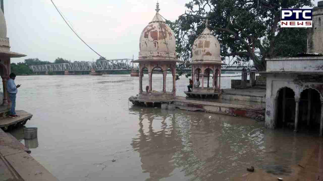 Mathura: A temple is heavily flooded after the water level of the swollen Yamuna river enters the premises due to heavy rainfall, in Mathura on Wednesday. (ANI Photo)