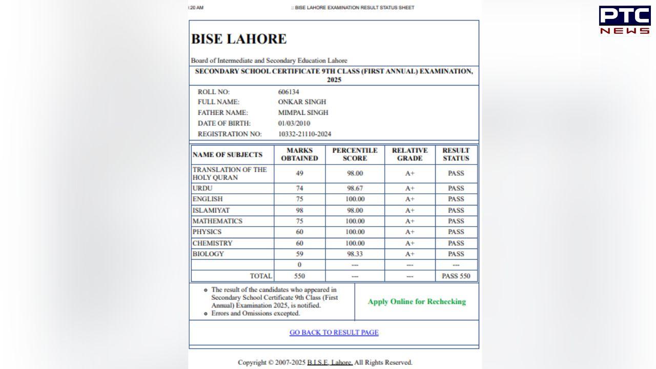 PTC News Desk: Onkar Singh, a 15-year-old Sikh student, has achieved outstanding results in the Lahore Board of Intermediate and Secondary Education (BISE) Class 9 Examination 2025. He secured A grades across all subjects, including an impressive 98 out of 100 in Islamiyat—a subject centered on Islam’s religion, worldview, and civilisation.