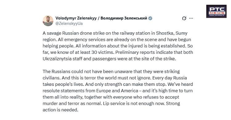 PTC Web Desk: At least 30 persons were killed in a Russian drone strike on a railway station in Ukraine’s northern Sumy region on Saturday, President Volodymyr Zelenskyy confirmed, denouncing the assault as “savage.”