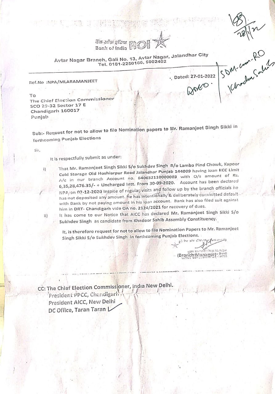 As the nomination process for Assembly elections 2022 in Punjab has started, the Bank of India has requested the Election Commission not to allow Congress candidate Ramanjeet Singh Sikki to file a nomination from the Khadoor Sahib constituency.