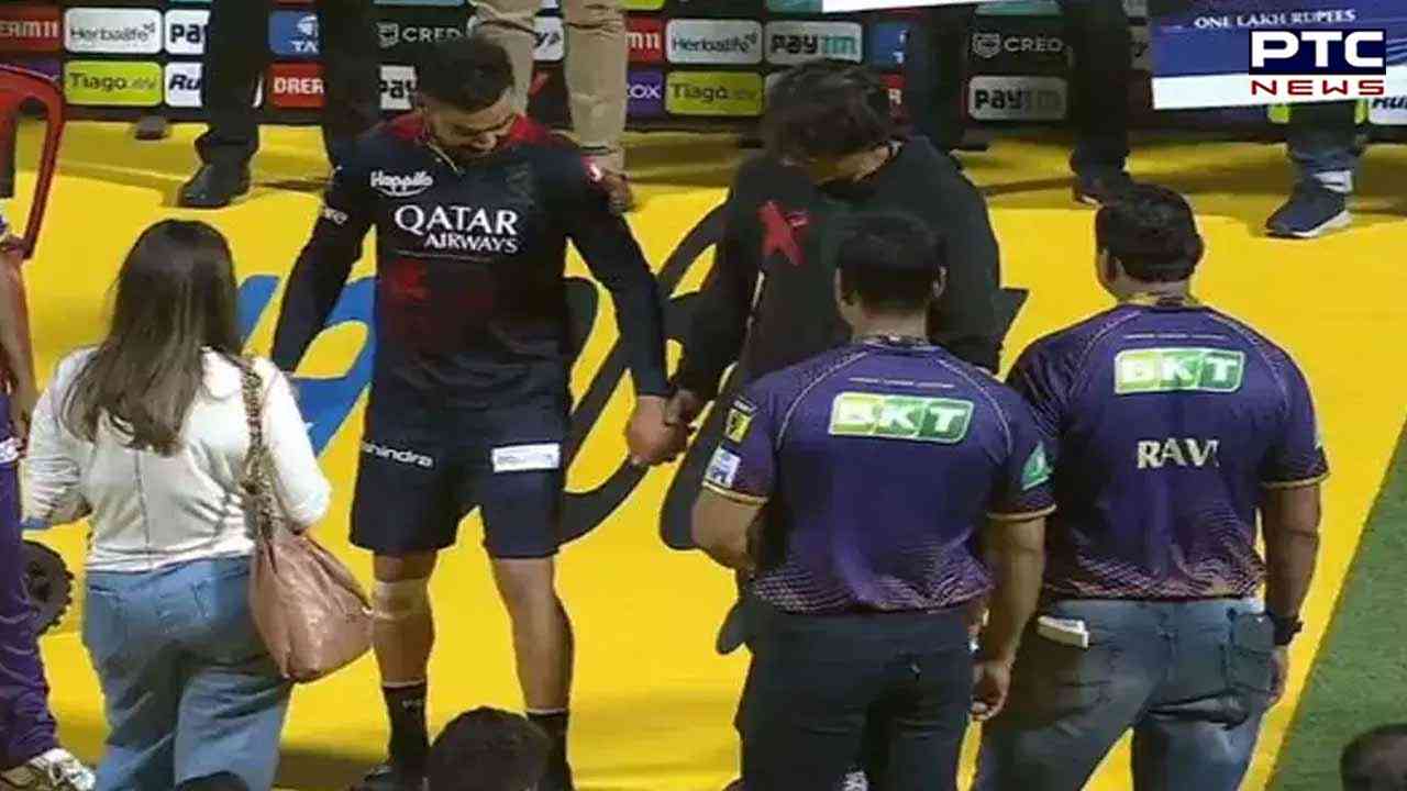 After KKR registered a remarkable win against the RCB, the team's co-owner SRK entered the ground and met all the players. He also interacted with former RCB skipper Virat Kohli.