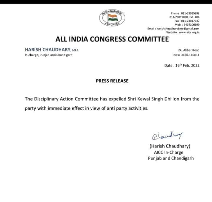 ਇਸ ਦੌਰਾਨ ਉਨ੍ਹਾਂ ਨੇ ਕਾਂਗਰਸ ਦੇ ਪੰਜਾਬ ਮਾਮਲਿਆਂ ਦੇ ਇੰਚਾਰਜ਼ ਹਰੀਸ਼ ਚੌਧਰੀ ਵਲੋਂ ਜਾਰੀ ਪੱਤਰ 'ਚ ਲਿਖਿਆ ਗਿਆ ਹੈ ਕਿ ਪਾਰਟੀ ਵਿਰੋਧੀ ਗਤੀਵਿਧੀਆਂ ਕਾਰਨ ਅਨੁਸ਼ਾਸ਼ਨੀ ਕਮੇਟੀ ਵਲੋਂ ਤੁਰੰਤ ਪ੍ਰਭਾਵ ਨਾਲ ਕੇਵਲ ਸਿੰਘ ਢਿੱਲੋਂ ਨੂੰ ਕਾਂਗਰਸ ਪਾਰਟੀ 'ਚੋਂ ਕੱਢਿਆ ਜਾਂਦਾ ਹੈ।