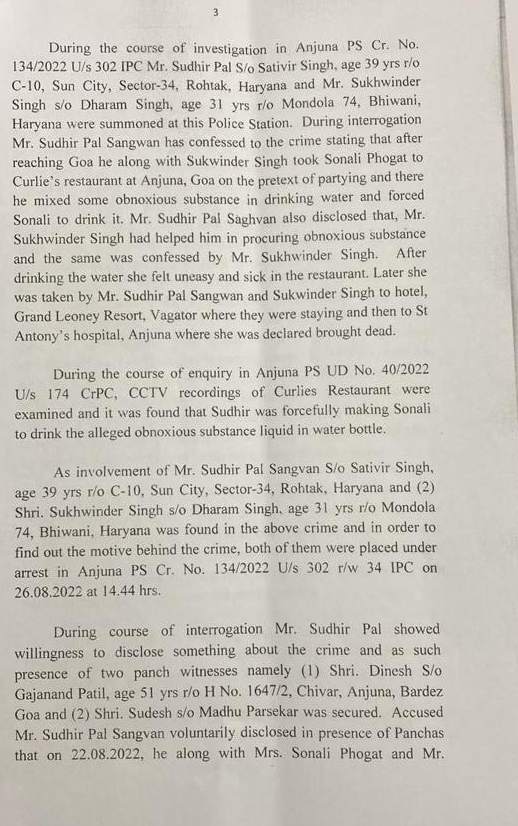 कंप्लेंट कॉपी में अंजुना पुलिस थाने के निरीक्षक प्रशल देसाई ने इस बात का जिक्र किया है कि फोगाट के पीए सुधीर ने अपना गुनाह स्वीकार कर लिया है। सुधीर ने माना है कि उसने ही सोनाली को पानी में मिलाकर ड्रग्स दिया था।