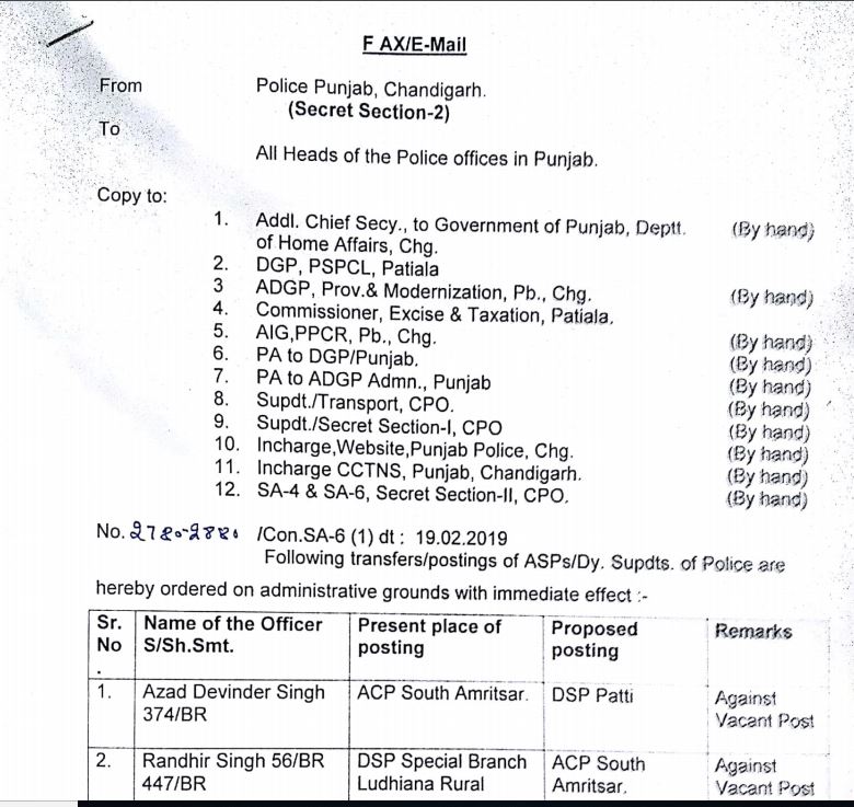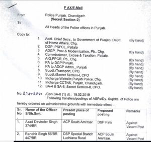 ਪੰਜਾਬ ਸਰਕਾਰ ਵਲੋਂ ਪੰਜਾਬ ਪੁਲਿਸ 'ਚ ਵੱਡਾ ਫੇਰਬਦਲ, 190 ਅਫਸਰਾਂ ਦਾ ਕੀਤਾ ਤਬਾਦਲਾ, ਪੜ੍ਹੋ ਸੂਚੀ