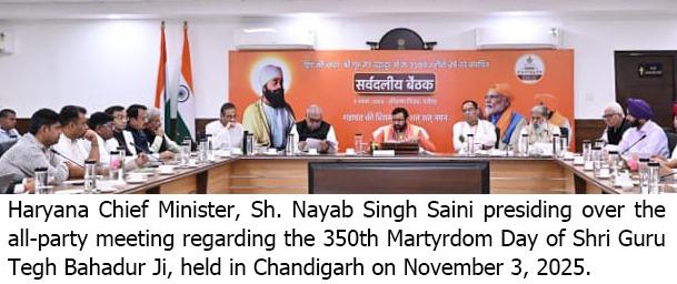 हिंद की चादर, धर्म, मानवता और राष्ट्र की रक्षा के प्रतीक श्री गुरु तेग बहादुर जी के 350वें शहीदी वर्ष के उपलक्ष्य में सर्वदलीय बैठक आयोजित की गई। इस बैठक में सभी दलों से आह्वान किया गया कि गुरु साहिब के 350वें शहीदी दिवस को हम सब मिलकर एक बड़े, ऐतिहासिक और गरिमामय स्तर पर सफल बनाएं।