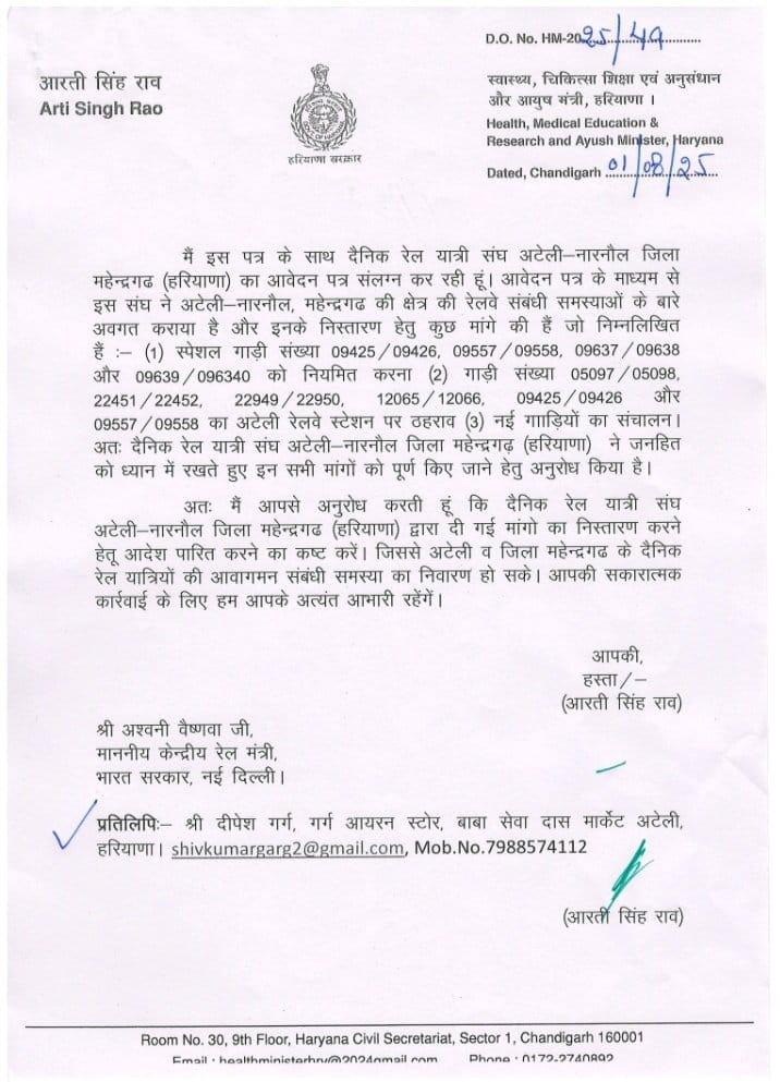 मंत्री आरती सिंह राव ने अपने पत्र में यह भी लिखा कि क्षेत्र के हजारों दैनिक यात्रियों को कामकाजी व पारिवारिक कारणों से नारनौल, रेवाड़ी, जयपुर, दिल्ली जैसे बड़े शहरों की यात्रा करनी पड़ती है, लेकिन सीमित ट्रेनों और उनके ठहराव की अनुपलब्धता के कारण उन्हें वैकल्पिक और असुविधाजनक साधनों का सहारा लेना पड़ता है।