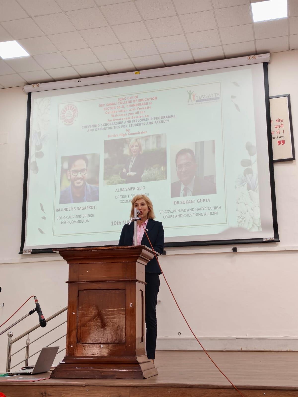 इस सत्र को ब्रिटिश डिप्टी हाई कमिश्नर, चंडीगढ़ अल्बा स्मेरीग्लियो, देव समाज कॉलेज ऑफ एजुकेशन की कार्यवाहक प्राचार्य डॉ. ऋचा शर्मा, ब्रिटिश हाई कमीशन के सीनियर एडवाइजर (पॉलिटिकल, मीडिया एवं माइग्रेशन) राजिंदर एस नगरकोटी, तथा वरिष्ठ अधिवक्ता एवं चेवनिंग एलुमनाई डॉ. सुकांत गुप्ता ने संबोधित किया। कार्यक्रम में कॉलेज के छात्र-छात्राओं और शिक्षकों ने भाग लिया और वक्ताओं से संवाद किया।