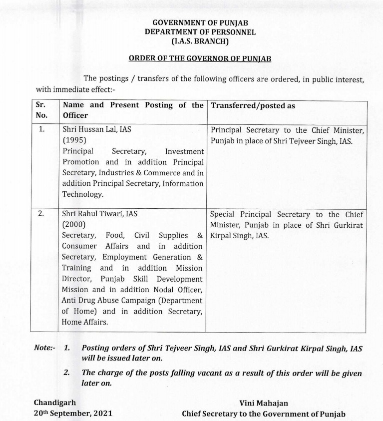 Punjab: Hussan Lal has been appointed the new Principal Secretary to the Chief Minister and Rahul Tiwari the new Special Principal Secretary to the Chief Minister.