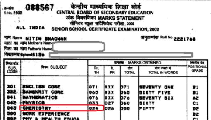 नई दिल्ली। केंद्रीय माध्यमिक शिक्षा बोर्ड (CBSE) के नतीजों के बीच एक आईएएस का ट्वीट इन दिनों सोशल मीडिया पर जमकर वायरल हो रहा है। दरअसल IAS अधिकारी नितिन सांगवान ने अपनी प्रेरणादायक कहानी ट्वीटर पर शेयर की है। उन्होंने अपनी मार्कशीट को शेयर करते हुए कहा कि जीवन बोर्ड के परिणामों से बहुत अधिक है। उन्होंने लिखा, 'मेरी 12वीं की परीक्षा में मुझे रसायन विज्ञान (केमिस्ट्री) में 24 अंक मिले थे, पासिंग नंबर से सिर्फ एक अधिक। लेकिन उसने यह तय नहीं किया कि मैं अपने जीवन से क्या चाहता था।'