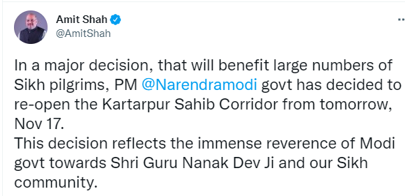 Amit Shah tweeted: "In a major decision that'll benefit large numbers of Sikh pilgrims, govt has decided to re-open Kartarpur Sahib Corridor from tomorrow, Nov 17."