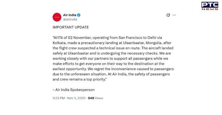 PTC Web Desk: An Air India flight from San Francisco to Delhi, operating via Kolkata, was diverted to Ulaanbaatar, Mongolia, on Sunday after the flight crew detected a suspected technical issue mid-air. The Boeing 777 aircraft, operating as flight AI174 on November 2, made a precautionary landing at Ulaanbaatar and landed safely, according to the airline. All passengers and crew members were reported to be safe.