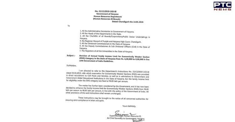 Earlier, the income limit for the EWS category in Haryana was fixed at Rs 6 lakh per annum under orders issued on February 25, 2019. After reviewing the matter, the state government decided to revise the threshold to Rs 8 lakh annually. Officials clarified that apart from the change in income limit, all other existing instructions related to the EWS category will remain unchanged.