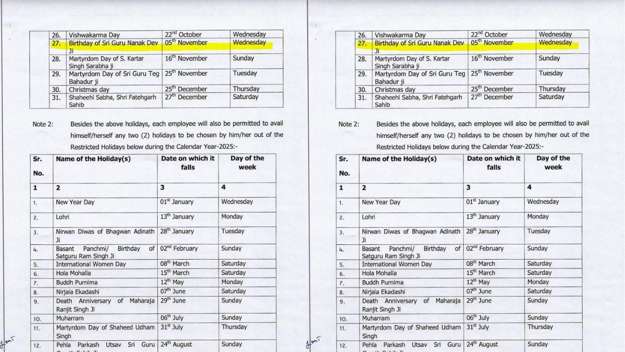 ਸ੍ਰੀ ਗੁਰੂ ਨਾਨਕ ਦੇਵ ਜੀ ਦੇ ਪ੍ਰਕਾਸ਼ ਪੁਰਬ ਮੌਕੇ 5 ਨਵੰਬਰ, ਬੁੱਧਵਾਰ ਨੂੰ ਪੰਜਾਬ ਭਰ ਵਿੱਚ ਸਰਕਾਰੀ ਛੁੱਟੀ ਰਹੇਗੀ। ਇਸ ਦਿਨ ਸਕੂਲ, ਕਾਲਜ ਅਤੇ ਸਰਕਾਰੀ ਦਫ਼ਤਰ ਬੰਦ ਰਹਿਣਗੇ। ਪੰਜਾਬ ਸਰਕਾਰ ਦੇ ਛੁੱਟੀਆਂ ਦੇ ਕੈਲੰਡਰ ਵਿੱਚ 5 ਨਵੰਬਰ ਨੂੰ ਛੁੱਟੀ ਘੋਸ਼ਿਤ ਕੀਤੀ ਗਈ ਹੈ।