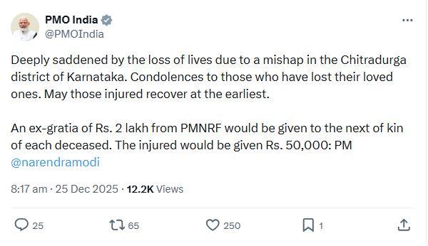ਇਸ ਘਟਨਾ 'ਤੇ ਪ੍ਰਤੀਕਿਰਿਆ ਦਿੰਦੇ ਹੋਏ, ਪੀਐਮਓ ਨੇ ਇੱਕ ਟਵੀਟ ਵਿੱਚ ਕਿਹਾ, "ਕਰਨਾਟਕ ਦੇ ਚਿੱਤਰਦੁਰਗਾ ਜ਼ਿਲ੍ਹੇ ਵਿੱਚ ਇੱਕ ਹਾਦਸੇ ਕਾਰਨ ਹੋਏ ਜਾਨੀ ਨੁਕਸਾਨ 'ਤੇ ਬਹੁਤ ਦੁੱਖ ਹੋਇਆ। ਉਨ੍ਹਾਂ ਲੋਕਾਂ ਪ੍ਰਤੀ ਸੰਵੇਦਨਾ ਜਿਨ੍ਹਾਂ ਨੇ ਆਪਣੇ ਅਜ਼ੀਜ਼ਾਂ ਨੂੰ ਗੁਆ ਦਿੱਤਾ ਹੈ। ਜ਼ਖਮੀਆਂ ਦੇ ਜਲਦੀ ਤੋਂ ਜਲਦੀ ਠੀਕ ਹੋਣ ਦੀ ਕਾਮਨਾ ਕਰਦਾ ਹਾਂ। ਹਰੇਕ ਮ੍ਰਿਤਕ ਦੇ ਰਿਸ਼ਤੇਦਾਰ ਨੂੰ ਪੀਐਮਐਨਆਰਐਫ ਤੋਂ 2 ਲੱਖ ਰੁਪਏ ਦੀ ਐਕਸ-ਗ੍ਰੇਸ਼ੀਆ ਦਿੱਤੀ ਜਾਵੇਗੀ। ਜ਼ਖਮੀਆਂ ਨੂੰ 50,000 ਰੁਪਏ ਦਿੱਤੇ ਜਾਣਗੇ।"