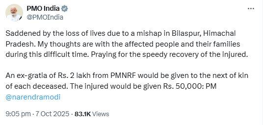 ਇਸ ਅਤਿ ਦੁਖਦਾਈ ਹਾਦਸੇ 'ਤੇ ਰਾਸ਼ਟਰਪਤੀ ਦ੍ਰੋਪਦੀ ਮੁਰਮੂ ਅਤੇ ਪ੍ਰਧਾਨ ਮੰਤਰੀ ਨਰਿੰਦਰ ਮੋਦੀ ਨੇ ਵੀ ਦੁੱਖ ਡੂੰਘਾ ਦੁੱਖ ਜ਼ਾਹਰ ਕੀਤਾ ਹੈ। ਪੀਐਮ ਮੋਦੀ ਨੇ ਪੀੜਤ ਪਰਿਵਾਰਕਾਂ ਨਾਲ ਦੁਖ ਜ਼ਾ਼ਹਰ ਕਰਦਿਆਂ ਇਸ ਔਖੀ ਘੜੀ ਵਿੱਚ ਨਾਲ ਖੜੇ ਰਹਿਣ ਲਈ ਹੌਸਲਾ ਦਿੱਤਾ ਹੈ। ਪ੍ਰਧਾਨ ਮੰਤਰੀ ਵਲੋਂ ਮ੍ਰਿਤਕਾਂ ਦੇ ਪੀੜਤ ਪਰਿਵਾਰਾਂ ਲਈ 2-2 ਲੱਖ ਰੁਪਏ ਦੀ ਸਹਾਇਤਾ ਅਤੇ ਜ਼ਖ਼ਮੀਆਂ ਲਈ 50-50 ਹਜ਼ਾਰ ਰੁਪਏ ਦੀ ਸਹਾਇਤਾ ਦਾ ਐਲਾਨ ਕੀਤਾ ਹੈ।