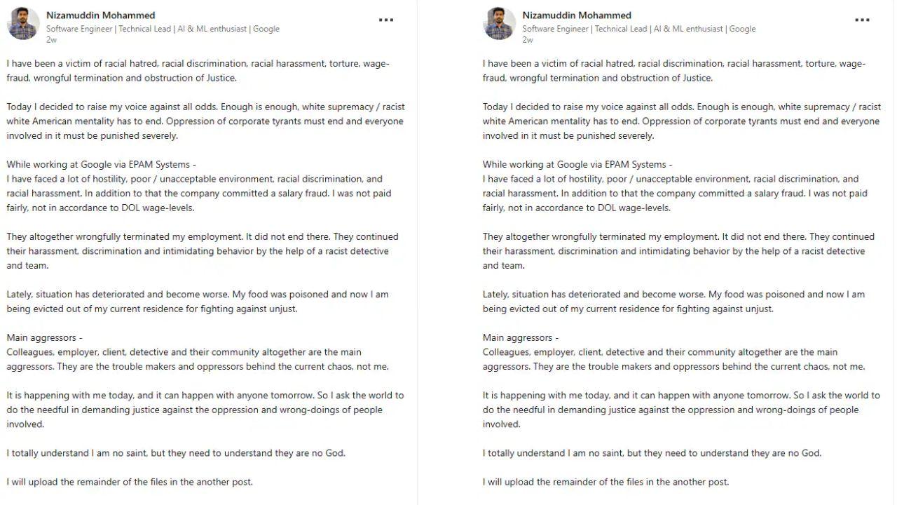 ਪੋਸਟ ਵਿੱਚ ਨਿਜ਼ਾਮੁਦੀਨ ਨੇ ਲਿਖਿਆ, "ਬਸ ਬਹੁਤ ਹੋ ਗਿਆ, ਗੋਰੇ ਸਰਬਉੱਚਤਾ/ਨਸਲਵਾਦੀ ਗੋਰੇ ਅਮਰੀਕੀ ਮਾਨਸਿਕਤਾ ਖਤਮ ਹੋਣੀ ਚਾਹੀਦੀ ਹੈ।" ਉਸਨੇ ਨਸਲੀ ਵਿਤਕਰੇ, ਉਸਦੇ ਭੋਜਨ ਵਿੱਚ ਜ਼ਹਿਰ, ਬੇਦਖਲੀ, ਅਤੇ ਇੱਕ ਜਾਸੂਸ ਦੁਆਰਾ ਨਿਰੰਤਰ ਨਿਗਰਾਨੀ ਅਤੇ ਧਮਕੀਆਂ ਦਾ ਦੋਸ਼ ਲਗਾਇਆ। ਇਸ ਪੋਸਟ ਦੇ ਕੁਝ ਹਿੱਸੇ ਉਸਦੀ ਮੌਤ ਤੋਂ ਬਾਅਦ ਸੋਸ਼ਲ ਮੀਡੀਆ ਅਤੇ ਕਮਿਊਨਿਟੀ ਚੈਨਲਾਂ 'ਤੇ ਸਾਂਝੇ ਕੀਤੇ ਗਏ ਸਨ।