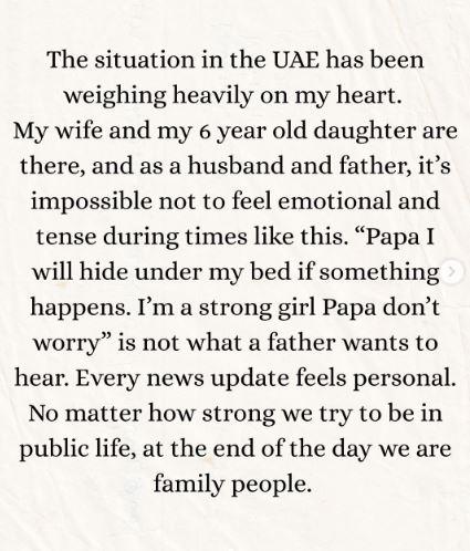ਆਪਣੀ ਚਿੰਤਾ ਨੂੰ ਸ਼ਬਦਾਂ ਵਿੱਚ ਬਿਆਨ ਕਰਦੇ ਹੋਏ ਫਿਲਮ 'ਕਿਸਮਤ' ਅਭਿਨੇਤਾ ਨੇ ਆਪਣੇ ਅਧਿਕਾਰਤ ਇੰਸਟਾ ਹੈਂਡਲ 'ਤੇ ਲਿਖਿਆ, "ਯੂਏਈ ਵਿੱਚ ਸਥਿਤੀ ਮੇਰੇ ਦਿਲ 'ਤੇ ਬਹੁਤ ਭਾਰੂ ਰਹੀ ਹੈ। ਮੇਰੀ ਪਤਨੀ ਅਤੇ ਮੇਰੀ 6 ਸਾਲ ਦੀ ਧੀ ਉੱਥੇ ਹਨ ਅਤੇ ਇੱਕ ਪਤੀ ਅਤੇ ਪਿਤਾ ਹੋਣ ਦੇ ਨਾਤੇ, ਅਜਿਹੇ ਸਮੇਂ ਵਿੱਚ ਭਾਵਨਾਤਮਕ ਅਤੇ ਤਣਾਅ ਮਹਿਸੂਸ ਨਾ ਕਰਨਾ ਅਸੰਭਵ ਹੈ।"