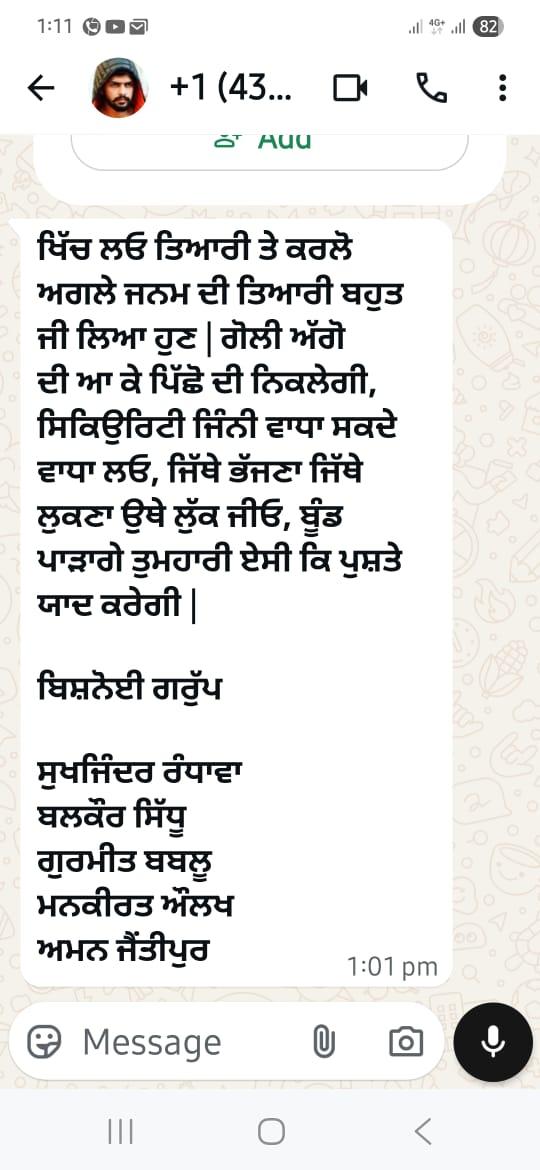 ਸ਼ਿਕਾਇਤ ਵਿੱਚ ਗੁਰਮੀਤ ਸਿੰਘ ਨੇ ਆਰੋਪ ਲਗਾਇਆ ਹੈ ਕਿ ਜਦੋਂ ਉਹ ਦੁਪਹਿਰ 1 ਵਜੇ ਦੇ ਕਰੀਬ ਆਪਣੀ ਰਿਹਾਇਸ਼ ਤੋਂ ਦਫਤਰ ਜਾ ਰਿਹਾ ਸੀ ਤਾਂ ਉਸਨੂੰ ਉਸਦੇ ਮੋਬਾਈਲ ਨੰਬਰ 'ਤੇ ਇੱਕ ਵਟਸਐਪ ਮੈਸੇਜ ਮਿਲਿਆ। ਇਹ ਮੈਸੇਜ "ਗੈਂਗਸਟਰ ਲਾਰੈਂਸ ਬਿਸ਼ਨੋਈ ਗਰੁੱਪ" ਨਾਲ ਸਬੰਧਤ ਇੱਕ ਨੰਬਰ ਤੋਂ ਭੇਜਿਆ ਗਿਆ ਸੀ। ਆਰੋਪ ਹੈ ਕਿ ਸੁਨੇਹਾ ਭੇਜਣ ਵਾਲੇ ਨੇ ਗਾਲੀ-ਗਲੋਚ ਕੀਤੀ ਅਤੇ ਉਸਨੂੰ ਗੋਲੀ ਮਾਰਨ ਅਤੇ ਜਾਨੋਂ ਮਾਰਨ ਦੀ ਧਮਕੀ ਦਿੱਤੀ ,ਭਾਵੇਂ ਉਹ ਕਿਤੇ ਵੀ ਲੁਕਿਆ ਹੋਵੇ।