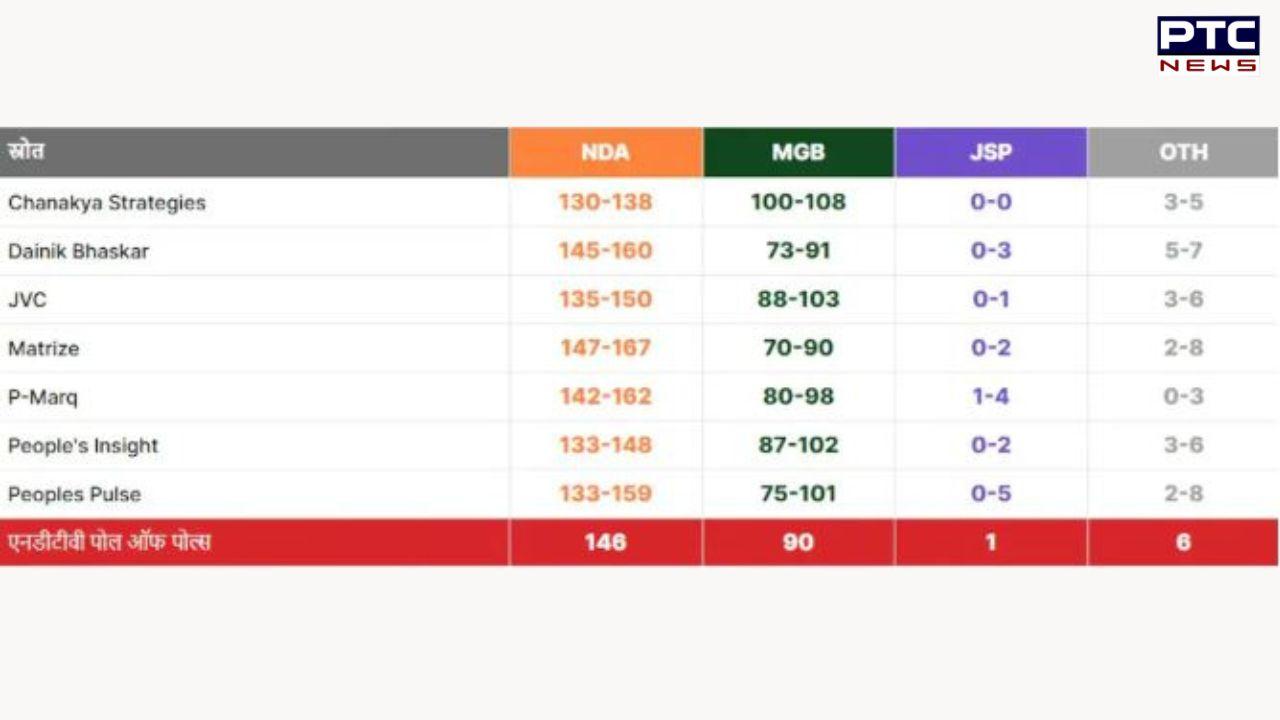 ਐਨਡੀਟੀਵੀ ਦੇ ਪੋਲ ਆਫ਼ ਪੋਲਜ਼ ਵਿੱਚ ਐਨਡੀਏ ਨੂੰ 152 ਸੀਟਾਂ, ਮਹਾਂ ਗੱਠਜੋੜ ਨੂੰ 84 ਸੀਟਾਂ, ਜਨ ਸੂਰਜ ਪਾਰਟੀ ਨੂੰ 2 ਸੀਟਾਂ ਅਤੇ ਹੋਰਾਂ ਨੂੰ 5 ਸੀਟਾਂ ਮਿਲਣ ਦੀ ਭਵਿੱਖਬਾਣੀ ਕੀਤੀ ਗਈ ਹੈ। ਐਗਜ਼ਿਟ ਪੋਲ ਬਿਹਾਰ ਵਿੱਚ ਐਨਡੀਏ ਲਈ ਭਾਰੀ ਜਿੱਤ ਦੀ ਭਵਿੱਖਬਾਣੀ ਕਰਦੇ ਹਨ।