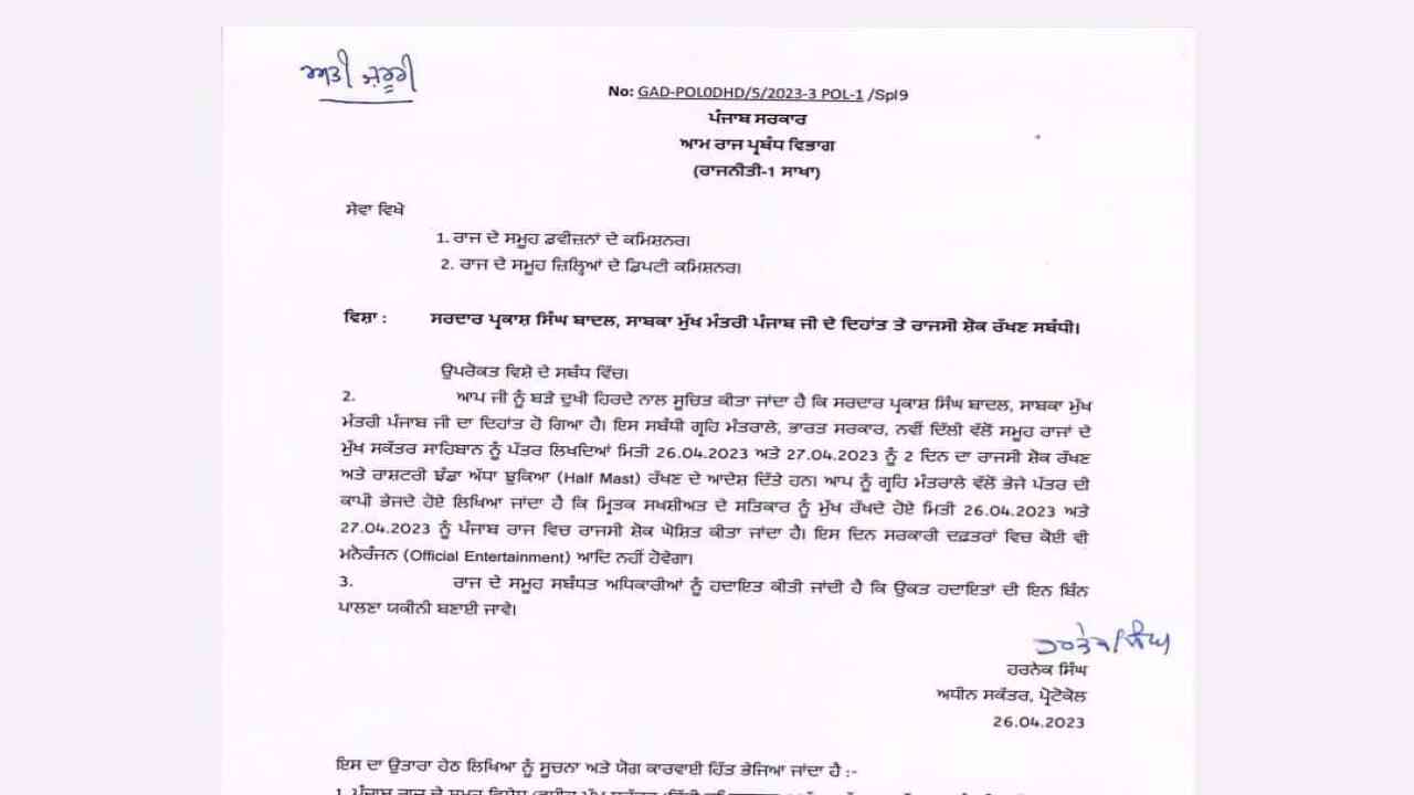 ਦੱਸ ਦੇਈਏ ਕਿ ਪੰਜਾਬ ਦੇ ਸਾਬਕਾ ਮੁੱਖ ਮੰਤਰੀ ਪ੍ਰਕਾਸ਼ ਸਿੰਘ ਬਾਦਲ ਦਾ ਮੰਗਲਵਾਰ ਰਾਤ ਨੂੰ ਦਿਹਾਂਤ ਹੋ ਗਿਆ ਹੈ। ਉਨ੍ਹਾਂ ਨੇ ਮੋਹਾਲੀ ਦੇ ਫੋਰਟਿਸ ਹਸਪਤਾਲ 'ਚ ਆਖਰੀ ਸਾਹ ਲਿਆ। ਉਨ੍ਹਾਂ ਦੀ ਮੌਤ ਤੋਂ ਬਾਅਦ ਪੂਰੇ ਦੇਸ਼ 'ਚ ਸੋਗ ਦੀ ਲਹਿਰ ਹੈ। ਕੇਂਦਰ ਸਰਕਾਰ ਨੇ ਬਾਦਲ ਦੀ ਮੌਤ 'ਤੇ ਦੋ ਦਿਨਾਂ (26 ਅਤੇ 27 ਅਪ੍ਰੈਲ) ਰਾਸ਼ਟਰੀ ਸੋਗ ਦਾ ਐਲਾਨ ਕੀਤਾ ਹੈ। ਇਸ ਦੌਰਾਨ ਰਾਸ਼ਟਰੀ ਝੰਡਾ ਅੱਧੇ ਝੁਕੇ ਰਹੇਗਾ ਅਤੇ ਕੋਈ ਵੀ ਸਰਕਾਰੀ ਮਨੋਰੰਜਨ ਪ੍ਰੋਗਰਾਮ ਨਹੀਂ ਹੋਵੇਗਾ।