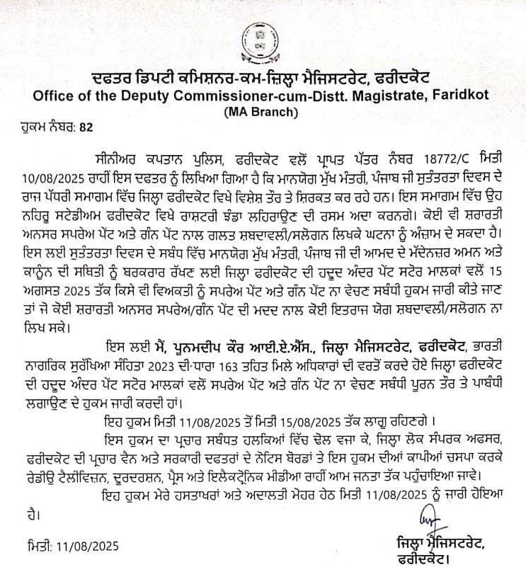 ਇਸ ਲਈ ਕੋਈ ਵੀ ਸ਼ਰਾਰਤੀ ਅਨਸਰ ਅਜਿਹਾ ਨਾ ਕਰ ਸਕੇ, ਜਿਸ ਲਈ ਭਾਰਤੀ ਨਾਗਰਿਕ ਸੁਰੱਖਿਆ ਸੰਹਿਤਾ 2023 ਦੀ ਧਾਂਰਾ 163 ਤਹਿਤ ਮਿਲੇ ਅਧਿਕਾਰਾਂ ਹੇਠ 11 ਅਗਸਤ ਤੋਂ 15 ਅਗਸਤ ਤੱਕ ਜ਼ਿਲ੍ਹੇ ਭਰ ਵਿੱਚ ਸਪਰੇਅ ਪੇਂਟ ਅਤੇ ਗੰਨ ਪੇਂਟ ਵੇਚਣ 'ਤੇ ਪੂਰੀ ਤਰ੍ਹਾਂ ਪਾਬੰਦੀ ਲਗਾਈ ਜਾਂਦੀ ਹੈ।