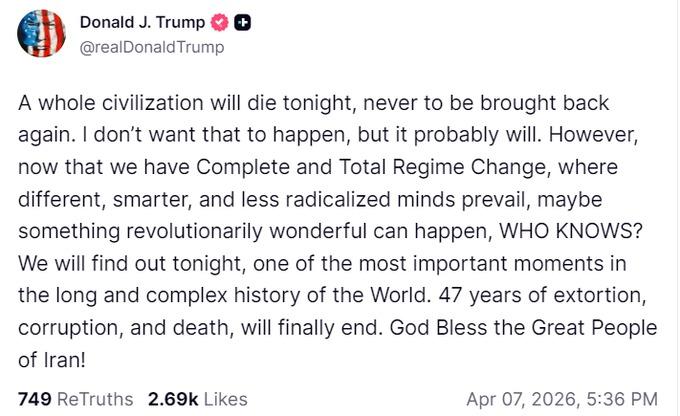 ਅਮਰੀਕੀ ਰਾਸ਼ਟਰਪਤੀ ਡੋਨਾਲਡ ਟਰੰਪ ਨੇ ਸੋਸ਼ਲ ਮੀਡੀਆ ਪਲੇਟਫਾਰਮ ਟਰੂਥ 'ਤੇ ਲਿਖਿਆ ਕਿ ਅੱਜ ਰਾਤ ਇੱਕ ਪੂਰੀ ਸਭਿਅਤਾ ਖਤਮ ਹੋ ਜਾਵੇਗੀ, ਜਿਸ ਨੂੰ ਮੁੜ ਕਦੇ ਨਹੀਂ ਵਾਪਸ ਲਿਆਂਦਾ ਜਾ ਸਕਦਾ। ਮੈਂ ਨਹੀਂ ਚਾਹੁੰਦਾ ਕਿ ਇਹ ਹੋਵੇ, ਪਰ ਸ਼ਾਇਦ ਅਜਿਹਾ ਹੀ ਹੋਵੇਗਾ।