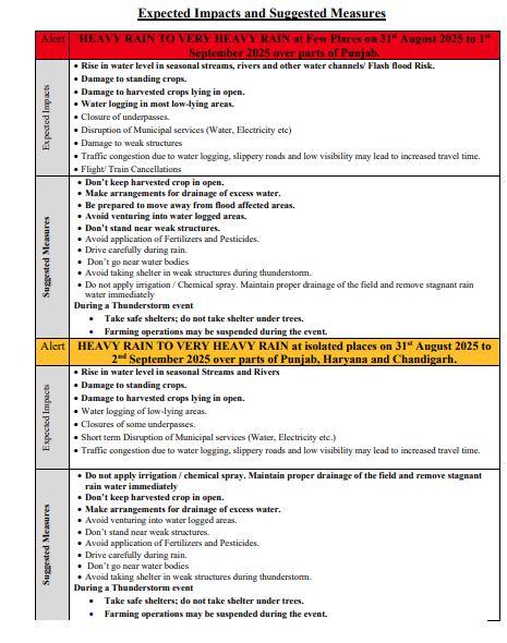 ਮੌਸਮ ਵਿਭਾਗ ਨੇ 31 ਅਗਸਤ 2025 ਤੋਂ 2 ਸਤੰਬਰ 2025 ਤੱਕ ਪੰਜਾਬ, ਹਰਿਆਣਾ ਅਤੇ ਚੰਡੀਗੜ੍ਹ ਦੇ ਕੁਝ ਹਿੱਸਿਆਂ ਵਿੱਚ ਭਾਰੀ ਤੋਂ ਬਹੁਤ ਭਾਰੀ ਬਾਰਿਸ਼ ਹੋਣ ਦੀ ਚੇਤਾਵਨੀ ਦਿੱਤੀ ਹੈ। ਇਸ ਸਮੇਂ ਦੌਰਾਨ, ਭਾਰੀ ਬਾਰਿਸ਼ ਆਮ ਜੀਵਨ ਅਤੇ ਖੇਤੀਬਾੜੀ 'ਤੇ ਵੱਡਾ ਪ੍ਰਭਾਵ ਪਾ ਸਕਦੀ ਹੈ।