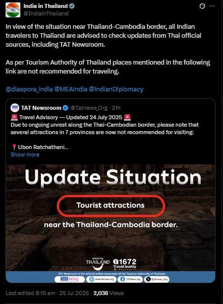 India Issue Advisory amid Thailand Cambodia Conflict : ਥਾਈਲੈਂਡ-ਕੰਬੋਡੀਆ ਸਰਹੱਦ 'ਤੇ ਵਧਦੇ ਤਣਾਅ ਦੇ ਮੱਦੇਨਜ਼ਰ, ਥਾਈਲੈਂਡ ਵਿੱਚ ਭਾਰਤੀ ਦੂਤਾਵਾਸ ਨੇ ਸ਼ੁੱਕਰਵਾਰ ਨੂੰ ਇੱਕ ਯਾਤਰਾ ਸਲਾਹ ਜਾਰੀ ਕੀਤੀ ਜਿਸ ਵਿੱਚ ਭਾਰਤੀ ਸੈਲਾਨੀਆਂ ਨੂੰ ਸਾਵਧਾਨ ਰਹਿਣ ਅਤੇ ਥਾਈਲੈਂਡ ਦੇ ਅਧਿਕਾਰਤ ਸਰੋਤਾਂ, ਜਿਵੇਂ ਕਿ ਟੂਰਿਜ਼ਮ ਅਥਾਰਟੀ ਆਫ਼ ਥਾਈਲੈਂਡ (TAT) ਨਾਲ ਜਾਂਚ ਕਰਦੇ ਰਹਿਣ ਲਈ ਕਿਹਾ ਗਿਆ।