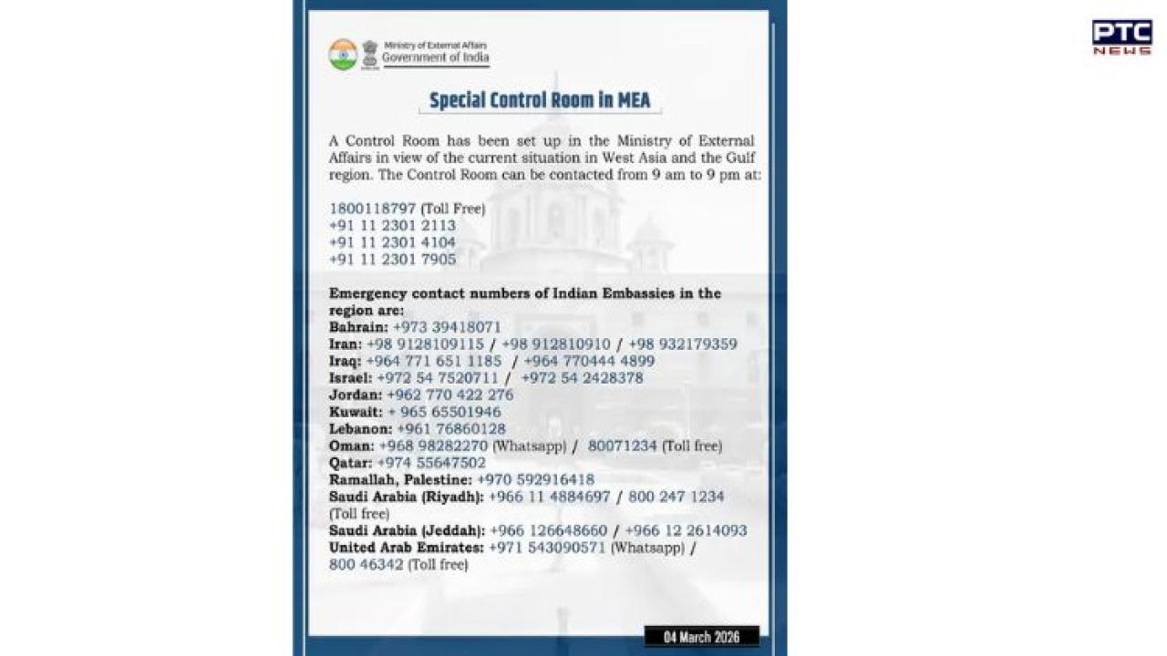ਵਿਦੇਸ਼ ਮੰਤਰਾਲੇ ਦੇ ਬੁਲਾਰੇ ਰਣਧੀਰ ਜੈਸਵਾਲ ਨੇ ਕਿਹਾ ਕਿ ਪੱਛਮੀ ਏਸ਼ੀਆ ਅਤੇ ਖਾੜੀ ਖੇਤਰ ਦੀ ਮੌਜੂਦਾ ਸਥਿਤੀ ਦੇ ਮੱਦੇਨਜ਼ਰ, ਵਿਦੇਸ਼ ਮੰਤਰਾਲੇ ਵਿੱਚ ਇੱਕ ਵਿਸ਼ੇਸ਼ ਕੰਟਰੋਲ ਰੂਮ ਸਥਾਪਤ ਕੀਤਾ ਗਿਆ ਹੈ। ਕੰਟਰੋਲ ਰੂਮ ਨਾਲ ਸਵੇਰੇ 9 ਵਜੇ ਤੋਂ ਰਾਤ 9 ਵਜੇ ਤੱਕ ਹੇਠ ਲਿਖੇ ਨੰਬਰਾਂ 'ਤੇ ਸੰਪਰਕ ਕੀਤਾ ਜਾ ਸਕਦਾ ਹੈ।