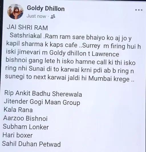 ਸੋਸ਼ਲ ਮੀਡੀਆ ਪੋਸਟ ਵਿੱਚ ਲਿਖਿਆ ਗਿਆ ਸੀ, "ਜੈ ਸ਼੍ਰੀ ਰਾਮ, ਸਤਿ ਸ਼੍ਰੀ ਅਕਾਲ, ਸਾਰੇ ਭਰਾਵਾਂ ਨੂੰ ਰਾਮ ਰਾਮ। ਅੱਜ ਕਪਿਲ ਸ਼ਰਮਾ ਦੇ "ਕੈਪਸ ਕੈਫੇ" ਸਰੀ 'ਚ ਹੋਈ ਗੋਲੀਬਾਰੀ ਦੀ ਜ਼ਿੰਮੇਵਾਰੀ ਮੈਂ ਗੋਲਡੀ ਢਿੱਲੋਂ ਅਤੇ ਲਾਰੈਂਸ ਬਿਸ਼ਨੋਈ ਗੈਂਗ ਲੈਂਦੇ ਹਨ। ਇਸਨੂੰ ਅਸੀਂ ਫੋਨ ਕੀਤਾ ਸੀ ,ਇਸਨੂੰ ਰਿੰਗ ਸੁਣਾਈ ਨਹੀਂ ਦਿੱਤੀ, ਇਸ ਲਈ ਸਾਨੂੰ ਕਾਰਵਾਈ ਕਰਨੀ ਪਈ। ਜੇਕਰ ਉਸਨੂੰ ਫਿਰ ਵੀ ਰਿੰਗ ਨਹੀਂ ਸੁਣਾਈ ਦਿੰਦੀ ਤਾਂ ਅਸੀਂ ਜਲਦੀ ਹੀ ਅਗਲੀ ਕਾਰਵਾਈ ਮੁੰਬਈ ਵਿੱਚ ਕਰਾਂਗੇ। ਹਾਲਾਂਕਿ ਪੀਟੀਸੀ ਨਿਊਜ਼ ਇਸਦੀ ਪੁਸ਼ਟੀ ਨਹੀਂ ਕਰਦਾ।