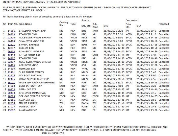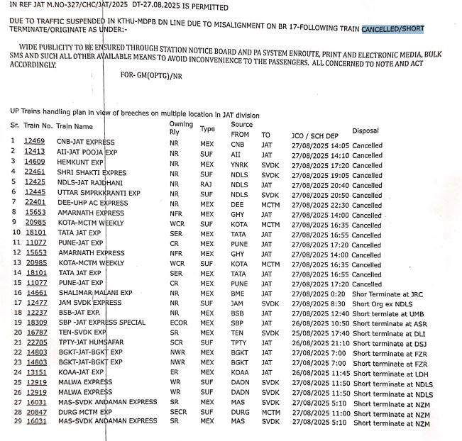 - 12920 ਜੰਮੂ ਤਵੀ – ਡਾ. ਅੰਬੇਡਕਰ ਨਗਰ (27.08.2025) (ਰੱਦ ਕਰਨ ਦੀ ਬਜਾਏ ਬਹਾਲ)