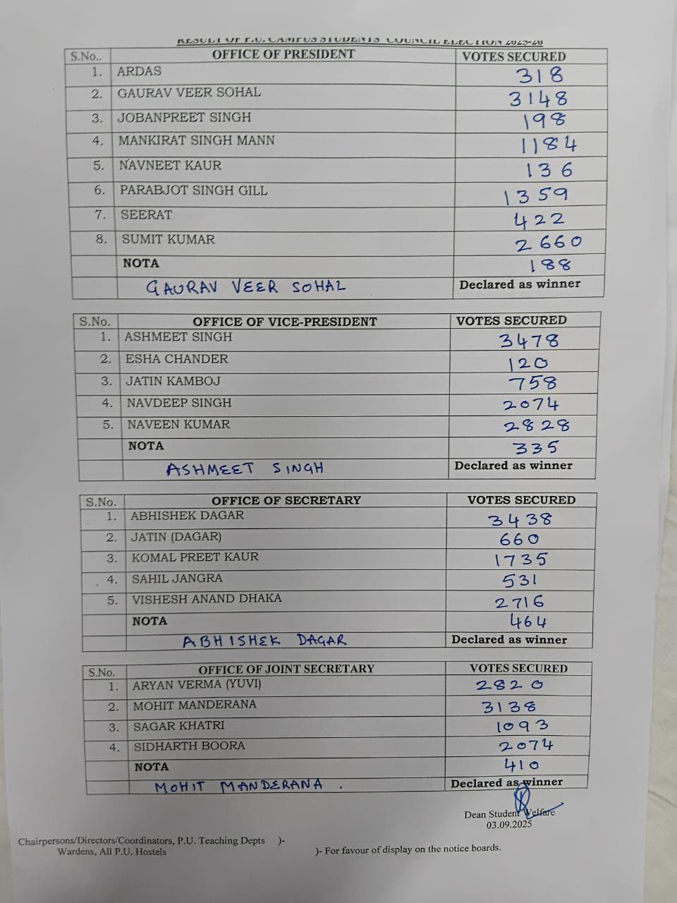 ਪੰਜਾਬ ਯੂਨੀਵਰਸਿਟੀ ਚੋਣਾਂ 'ਚ ਪ੍ਰਧਾਨ ਦੇ ਅਹੁਦੇ ਲਈ 8 ਉਮੀਦਵਾਰ ਮੈਦਾਨ ਵਿੱਚ ਸਨ। ਗੌਰਵ ਵੀਰ ਸੋਹਲ ਨੂੰ 3148 ਵੋਟਾਂ, ਅਰਦਾਸ ਨੂੰ 318 ਵੋਟਾਂ, ਜੋਬਨਪ੍ਰੀਤ ਸਿੰਘ ਨੂੰ 198 ਵੋਟਾਂ, ਮਨਕੀਰਤ ਸਿੰਘ ਮਾਨ ਨੂੰ 1184 ਵੋਟਾਂ, ਨਵਨੀਤ ਕੌਰ ਨੂੰ 136 ਵੋਟਾਂ, ਪਰਬਜੋਤ ਸਿੰਘ ਗਿੱਲ ਨੂੰ 1359 ਵੋਟਾਂ, ਸੀਰਤ ਨੂੰ 422 ਵੋਟਾਂ ਅਤੇ ਸੁਮਿਤ ਕੁਮਾਰ ਨੂੰ 2660 ਵੋਟਾਂ ਮਿਲੀਆਂ। ਜਦੋਂ ਕਿ 188 ਲੋਕਾਂ ਨੇ ਨੋਟਾ ਦਬਾਇਆ।