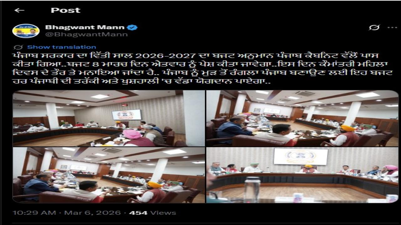 Punjab Budget Session 2026 Live : ਆਮ ਆਦਮੀ ਪਾਰਟੀ ਦੀ ਮੁੱਖ ਮੰਤਰੀ ਭਗਵੰਤ ਮਾਨ ਦੀ ਅਗਵਾਈ ਹੇਠ ਅੱਜ ਪੰਜਾਬ ਸਰਕਾਰ ਦੇ ਕਾਰਜਕਾਲ ਦਾ ਆਖਰੀ ਬਜਟ ਸੈਸ਼ਨ ਸ਼ੁਰੂ ਹੋਣ ਵਾਲਾ ਹੈ। ਇਹ ਬਜਟ 6 ਮਾਰਚ ਤੋਂ 16 ਮਾਰਚ ਤੱਕ ਚੱਲੇਗਾ। ਇਸਤੋਂ ਪਹਿਲਾਂ ਅੱਜ ਮੁੱਖ ਮੰਤਰੀ ਮਾਨ ਵੱਲੋਂ ਪੰਜਾਬ ਕੈਬਨਿਟ ਦੀ ਮਟਿੰਗ ਵੀ ਕੀਤੀ ਜਾਵੇਗੀ, ਜਿਸ ਵਿੱਚ ਸਭ ਤੋਂ ਵੱਡੇ ਮੁੱਦੇ ਔਰਤਾਂ ਨੂੰ 1000 ਰੁਪਏ ਦੇ ਫੈਸਲੇ ਨੂੰ ਲੈ ਕੇ ਚਰਚਾ ਹੋਵੇਗੀ, ਉਥੇ ਹੀ ਕਈ ਫੈਸਲੇ ਲਾਗੂ ਕੀਤੇ ਜਾ ਸਕਦੇ ਹਨ।