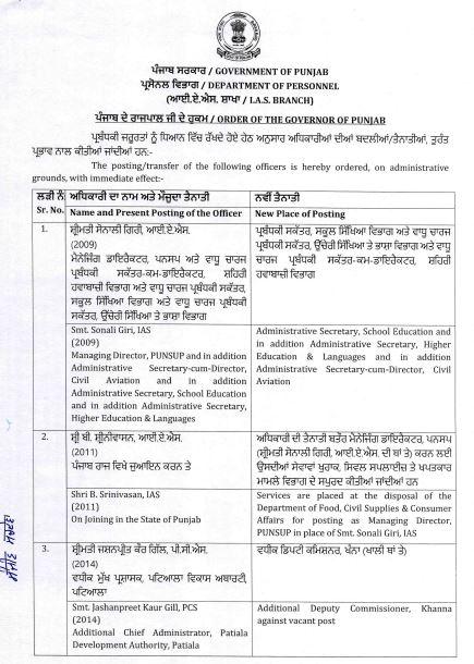 ਹੁਕਮਾਂ ਦੇ ਤਹਿਤ, ਸ਼੍ਰੀਮਤੀ ਸੋਨਾਲੀ ਗਿਰੀ, 2009 ਬੈਚ ਦੀ ਆਈਏਐਸ ਅਧਿਕਾਰੀ, ਨੂੰ ਪ੍ਰਸ਼ਾਸਨਿਕ ਸਕੱਤਰ, ਸਕੂਲ ਸਿੱਖਿਆ ਦੇ ਨਾਲ-ਨਾਲ ਉੱਚ ਸਿੱਖਿਆ ਅਤੇ ਭਾਸ਼ਾ ਵਿਭਾਗ, ਸ਼ਹਿਰੀ ਹਵਾਬਾਜ਼ੀ ਦੇ ਪ੍ਰਸ਼ਾਸਨਿਕ ਸਕੱਤਰ ਵਜੋਂ ਵਾਧੂ ਚਾਰਜ ਦੇ ਨਾਲ ਨਿਯੁਕਤ ਕੀਤਾ ਗਿਆ ਹੈ। ਪਹਿਲਾਂ, ਉਹ ਨਿਵੇਸ਼ਕ ਅਤੇ ਨਿਰਯਾਤ ਪ੍ਰਮੋਸ਼ਨ, ਸੂਚਨਾ ਤਕਨਾਲੋਜੀ, ਅਤੇ ਪ੍ਰਬੰਧਕੀ ਸਕੱਤਰ, ਉੱਚ ਸਿੱਖਿਆ ਅਤੇ ਭਾਸ਼ਾਵਾਂ ਦੇ ਅਹੁਦਿਆਂ 'ਤੇ ਸੀ।