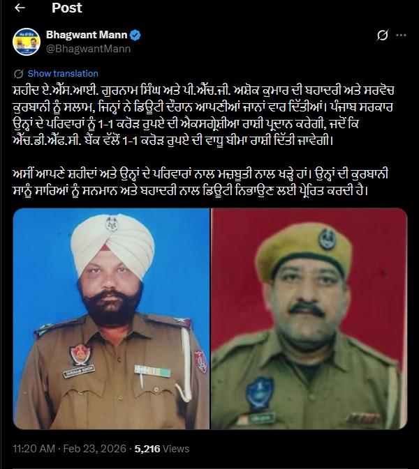 Gurdaspur Policemen Death : ਗੁਰਦਾਸਪੁਰ ਦੇ ਮ੍ਰਿਤਕ ਪੁਲਿਸ ਮੁਲਾਜ਼ਮਾਂ ਦੇ ਪੀੜਤਾਂ ਨੂੰ ਮਿਲੇਗੀ 1-1 ਕਰੋੜ ਰੁਪਏ ਐਕਸ-ਗ੍ਰੇਸ਼ੀਆ