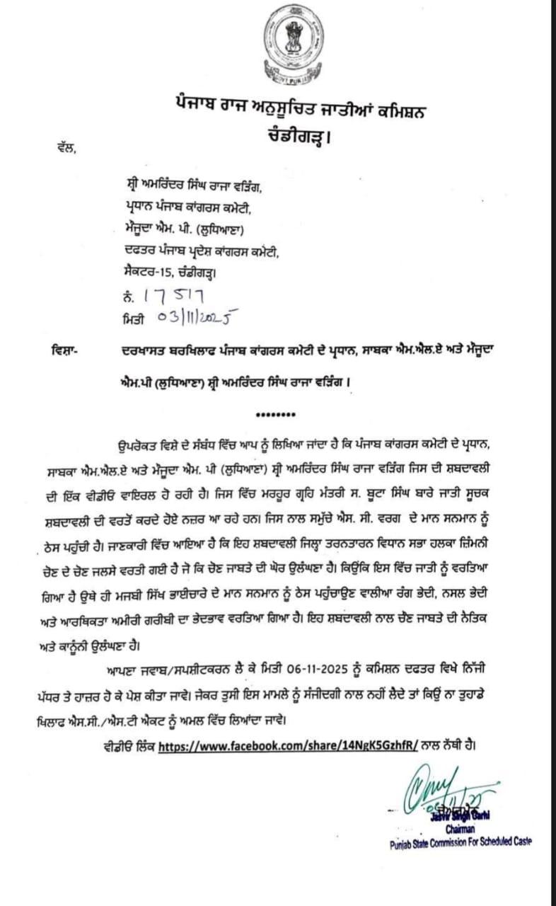 Raja Warring summons News : ਪੰਜਾਬ ਰਾਜ ਅਨੁਸੂਚਿਤ ਜਾਤੀਆਂ ਕਮਿਸ਼ਨ ਵਲੋਂ ਪੰਜਾਬ ਕਾਂਗਰਸ ਕਮੇਟੀ ਦੇ ਪ੍ਰਧਾਨ ਤੇ ਲੁਧਿਆਣਾ ਤੋਂ ਲੋਕ ਸਭਾ ਮੈਂਬਰ ਅਮਰਿੰਦਰ ਸਿੰਘ ਰਾਜਾ ਵੜਿੰਗ ਵੱਲੋਂ ਤਰਨਤਾਰਨ ਵਿਧਾਨ ਸਭਾ ਜ਼ਿਮਨੀ ਚੋਣਾਂ ਦੇ ਮੱਦੇਨਜ਼ਰ ਚੋਣ ਜਲਸੇ ਦੌਰਾਨ ਮਰਹੂਮ ਗ੍ਰਹਿ ਮੰਤਰੀ ਬੂਟਾ ਸਿੰਘ ਪ੍ਰਤੀ ਵਰਤੀ ਸ਼ਬਦਾਵਲੀ ਦਾ ਸੂ ਮੋਟੋ ਨੋਟਿਸ ਲਿਆ ਹੈ।