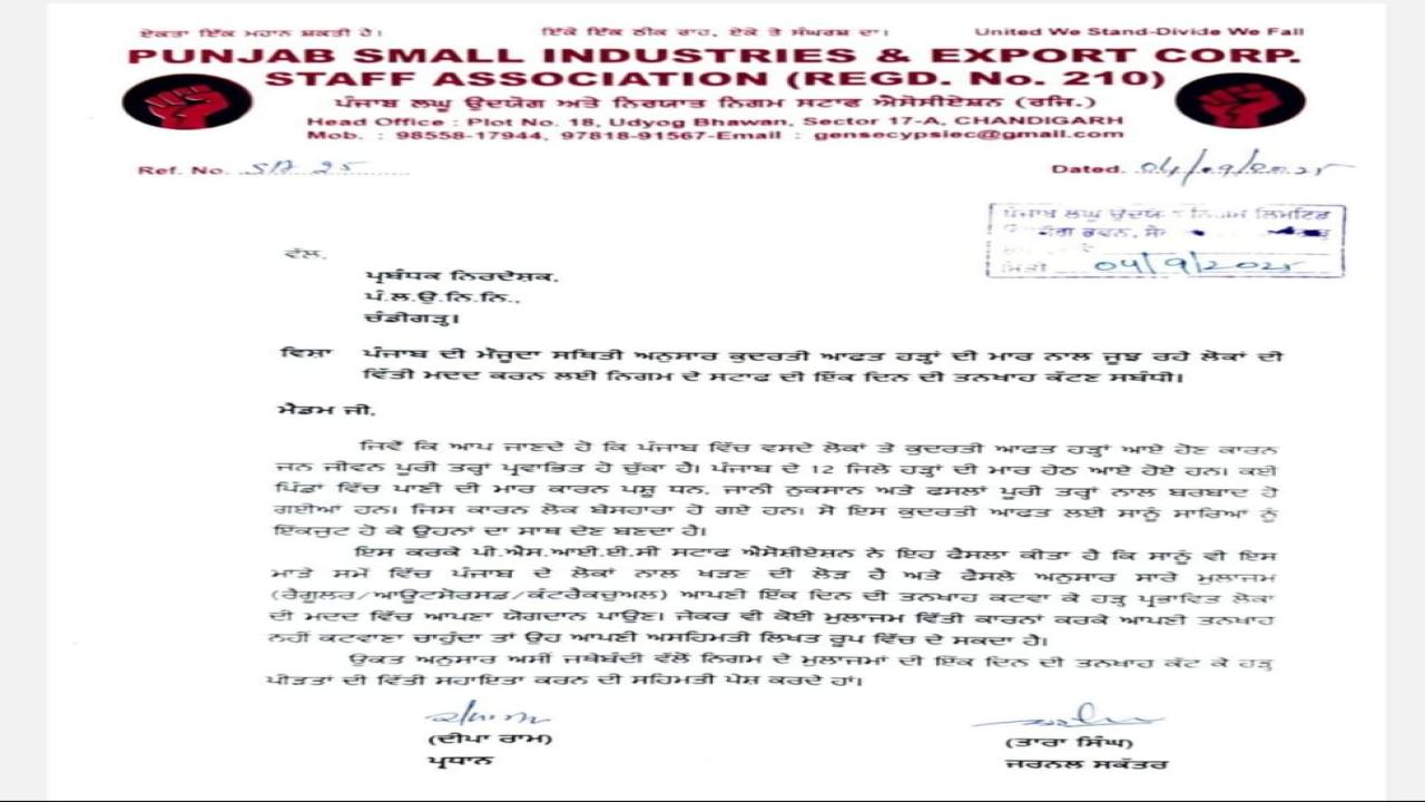 Punjab Floods Live Updagtes : ਪੰਜਾਬ ਸਮਾਲ ਇੰਡਸਟਰੀਜ ਸਟਾਫ਼ ਅਤੇ ਐਕਸਪੌਰਟ ਕਾਰਪੋਰੇਸ਼ਨ ਐਸੋਸੀਏਸ਼ਨ ਵਲੋਂ ਇਕ ਦਿਨ ਦੀ ਤਨਖ਼ਾਹ ਹੜ ਪੀੜਤਾਂ ਨੂੰ ਦੇਣ ਦਾ ਐਲਾਨ