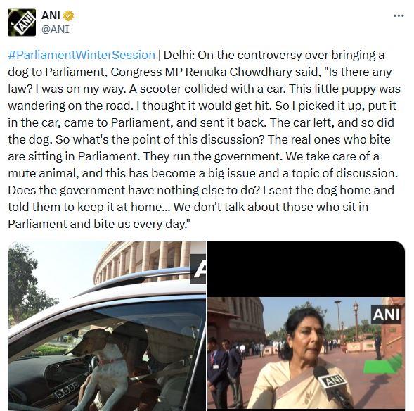 ਇਸ ਦੌਰਾਨ, ਉਸਨੇ ਪੁੱਛਿਆ, "ਕਿਹੜੀ ਫੋਟੋ? ਕੀ ਕੋਈ ਕਾਨੂੰਨ ਬਣਿਆ ਹੈ?" ਉਨ੍ਹਾਂ ਨੇ ਕਿਹਾ, "ਮੈਂ ਸੜਕ 'ਤੇ ਆ ਰਹੀ ਸੀ ਜਦੋਂ ਇੱਕ ਸਕੂਟਰ ਚਾਲਕ ਇੱਕ ਕਾਰ ਚਾਲਕ ਨਾਲ ਟਕਰਾ ਗਿਆ। ਇਹ ਛੋਟਾ ਕੁੱਤਾ ਉਨ੍ਹਾਂ ਦੇ ਸਾਹਮਣੇ ਆਇਆ ਅਤੇ ਸੜਕ 'ਤੇ ਘੁੰਮ ਰਿਹਾ ਸੀ। ਮੈਂ ਸੋਚਿਆ ਕਿ ਇਹ ਕਿਸੇ ਵਾਹਨ ਦੇ ਟਾਇਰ ਹੇਠਾਂ ਆ ਜਾਵੇਗਾ। ਇਸ ਲਈ ਮੈਂ ਇਸਨੂੰ ਚੁੱਕਿਆ, ਕਾਰ ਵਿੱਚ ਲਿਆ ਅਤੇ ਅਤੇ ਸੰਸਦ ਵਿੱਚ ਲੈ ਆਈ।" ਰੇਣੂਕਾ ਨੇ ਕਿਹਾ, "ਮੈਂ ਇਸਨੂੰ ਵਾਪਸ ਵੀ ਭੇਜ ਦਿੱਤਾ।" ਕਾਂਗਰਸ ਸੰਸਦ ਮੈਂਬਰ ਨੇ ਕਿਹਾ, "ਕਾਰ ਵੀ ਚਲੀ ਗਈ ਅਤੇ ਕੁੱਤਾ ਵੀ, ਤਾਂ ਚਰਚਾ ਕਿਸ ਬਾਰੇ ਹੈ?"