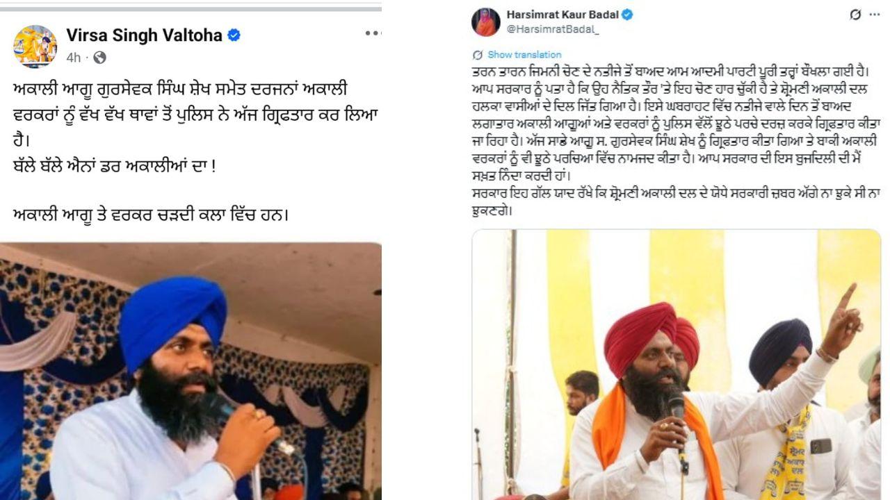 Shiromani Akali Dal : ਤਰਨਤਾਰਨ ਜ਼ਿਮਨੀ ਚੋਣਾਂ ਭਾਵੇਂ ਨਿਬੜ ਗਈਆਂ ਹਨ, ਪਰ ਪੰਜਾਬ ਪੁਲਿਸ ਵੱਲੋਂ ਹਲਕੇ 'ਚ ਸ਼੍ਰੋਮਣੀ ਅਕਾਲੀ ਦਲ ਦੇ ਆਗੂਆਂ ਤੇ ਵਰਕਰਾਂ ਖਿਲਾਫ਼ ਕਾਰਵਾਈ ਰੁਕਣ ਦਾ ਨਾਂਅ ਨਹੀਂ ਲੈ ਰਹੀ। ਪੰਜਾਬ ਪੁਲਿਸ ਵੱਲੋਂ ਅਕਾਲੀ ਦਲ ਦੇ ਨਛੱਤਰ ਸਿੰਘ ਗਿੱਲ ਦੀ ਗ੍ਰਿਫ਼ਤਾਰੀ ਤੋਂ ਬਾਅਦ ਇੱਕ ਹੋਰ ਸੀਨੀਅਰ ਆਗੂ ਗੁਰਸੇਵਕ ਸਿੰਘ ਸ਼ੇਖ ਨੂੰ ਗ੍ਰਿਫ਼ਤਾਰ ਕੀਤੇ ਜਾਣ ਦਾ ਦਾਅਵਾ ਕੀਤਾ ਗਿਆ ਹੈ। ਇਹ ਦਾਅਵਾ ਅਕਾਲੀ ਦਲ ਦੇ ਸਾਬਕਾ ਵਿਧਾਇਕ ਵਿਰਸਾ ਸਿੰਘ ਵਲਟੋਹਾ, ਸਾਬਕਾ ਵਿਧਾਇਕ ਰਵਿੰਦਰ ਸਿੰਘ ਬ੍ਰਹਮਪੁਰਾ ਅਤੇ ਬੀਬੀ ਕੰਚਨਪ੍ਰੀਤ ਕੌਰ ਨੇ ਕੀਤਾ ਹੈ।